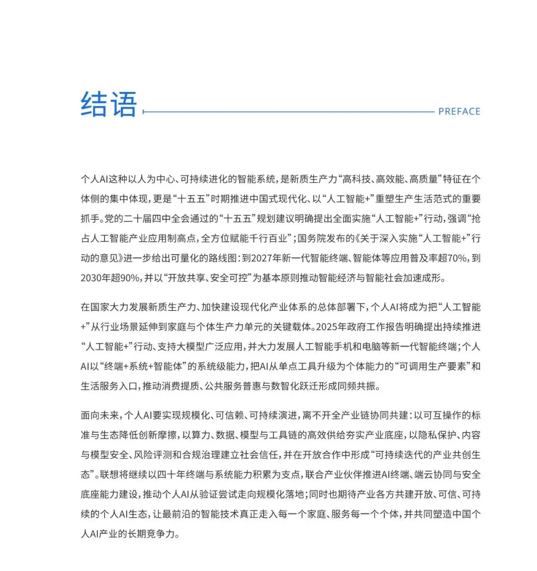 个人 AI 是新质生产力在个体侧的集中体现,是 “人工智能 +” 重塑生产生活范式的重要抓手。在国家政策支持下,个人 AI 将成为把 “人工智能 +” 延伸到家庭与个体生产力单元的关键载体,推动消费提质、公共服务普惠与数智化跃迁。未来需要全产业链协同共建,以标准与生态降低创新摩擦,以高效供给夯实产业底座,以安全治理建立社会信任,形成可持续迭代的产业共创生态。联想将联合产业伙伴推进 AI 终端、端云协同与安全底座能力建设,推动个人 AI 从验证尝试走向规模化落地。