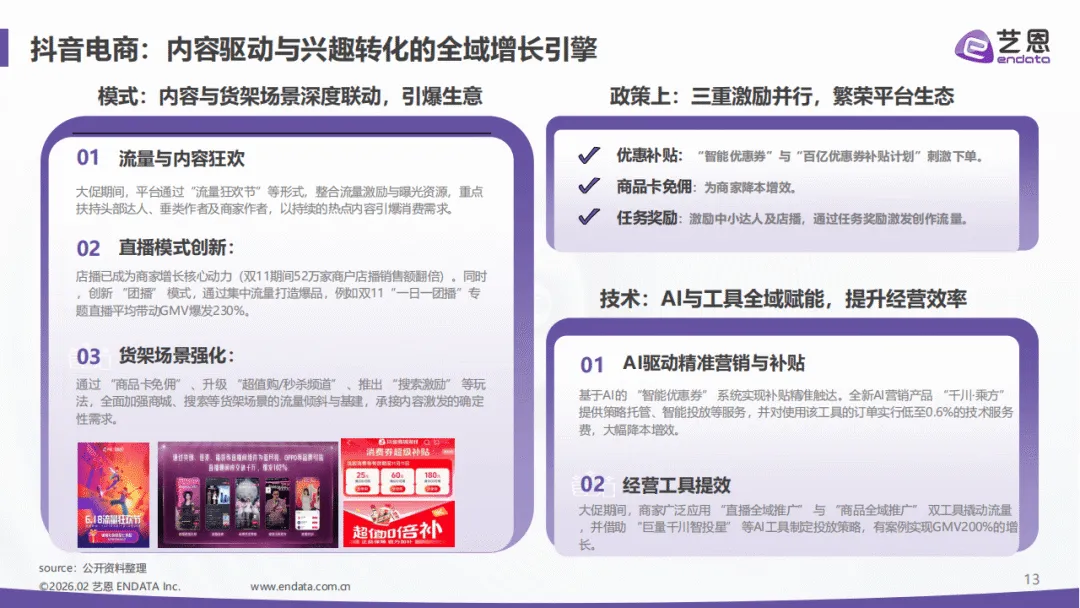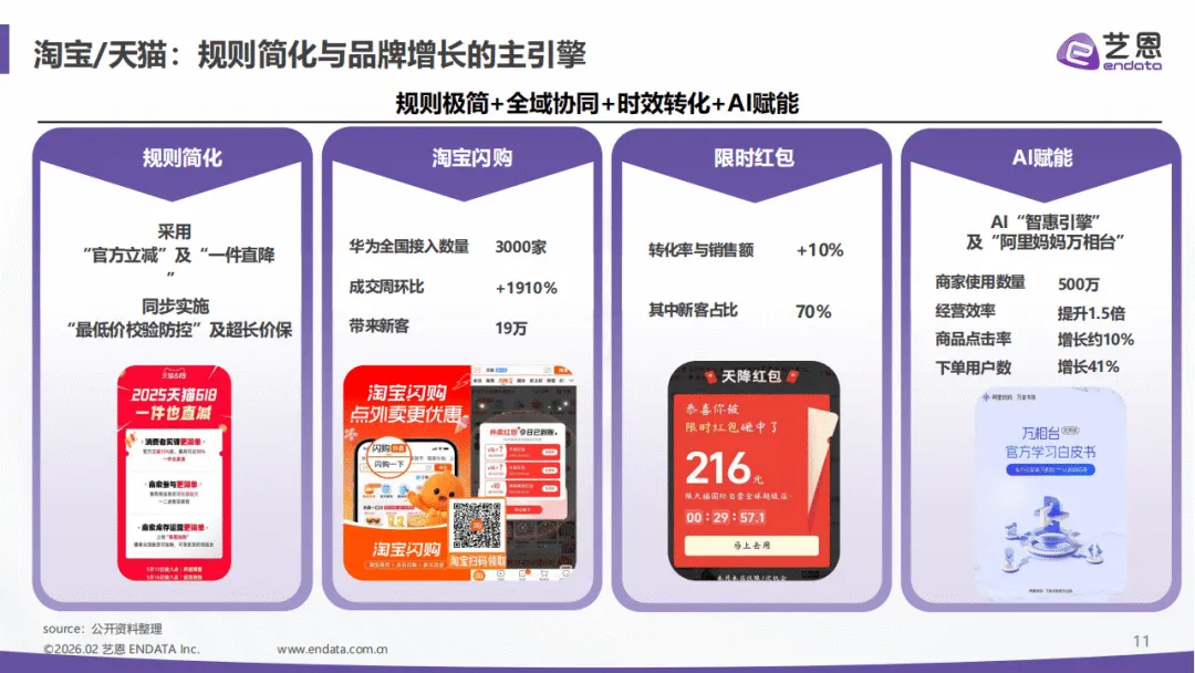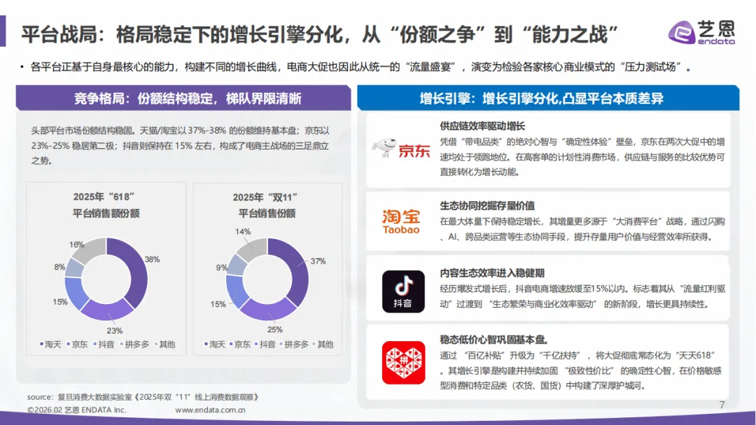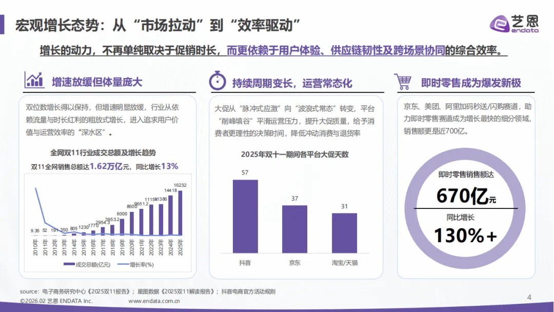 2026年3月艺恩发布的《电商大促新周期新打法洞察报告》指出,电商大促已从节点狂欢迈入常态深耕的新周期,行业从流量红利驱动的粗放式增长,转向以用户价值和运营效率为核心的“深水区”发展。2025年双11全网销售额达1.62万亿元,同比增13%,大促周期持续拉长、运营常态化,即时零售更是成为增长新极,双11期间销售额近670亿元,同比增长超130%。