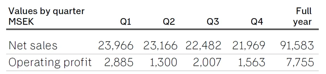 2025年营业利润(Operating profit)为77.55 亿瑞典克朗【70.33 亿人民币】; 2024年:103.39 亿瑞典克朗; 2025年相对2024年下降25%,2024年相对2023年下降约 6.7%;