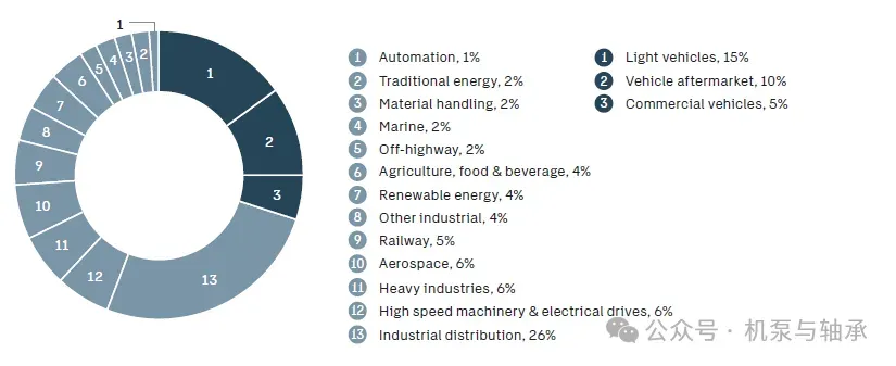 工业销售主要包括:工业驱动、重工业(如:冶金、采矿、水泥,纸浆与造纸)、其他工业(如:自动化和机床)、铁路、船舶、能源(如:风能和太阳能)和航空航天等领域的公司。汽车业务主要包括:汽车、轻型和重型卡车、拖车、巴士、两轮车以及车辆售后市场的制造商。