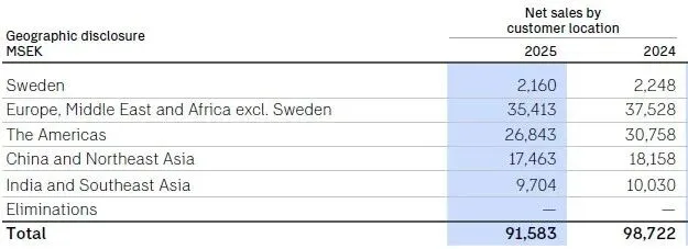 2025年业务销售额 268.43 亿克朗【2025年汇率:27.25 亿美元】,占比全球 29%,按瑞典克朗同比下降约 12.73%【按美元同比下降 6.36%】; 2024年业务销售额 307.58 亿克朗【2024年汇率:29.1 亿美元】,占比全球 31%,按瑞典克朗同比2023下降 1%; 2025年:工业占比28%,汽车占比32%;2025年:工业占比30%,汽车占比33%;