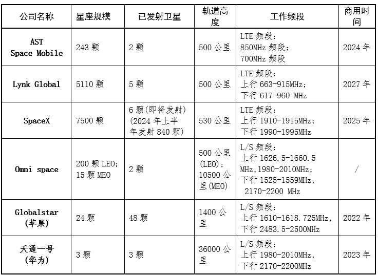 全球主要几家手机直连卫星公司情况如表1.