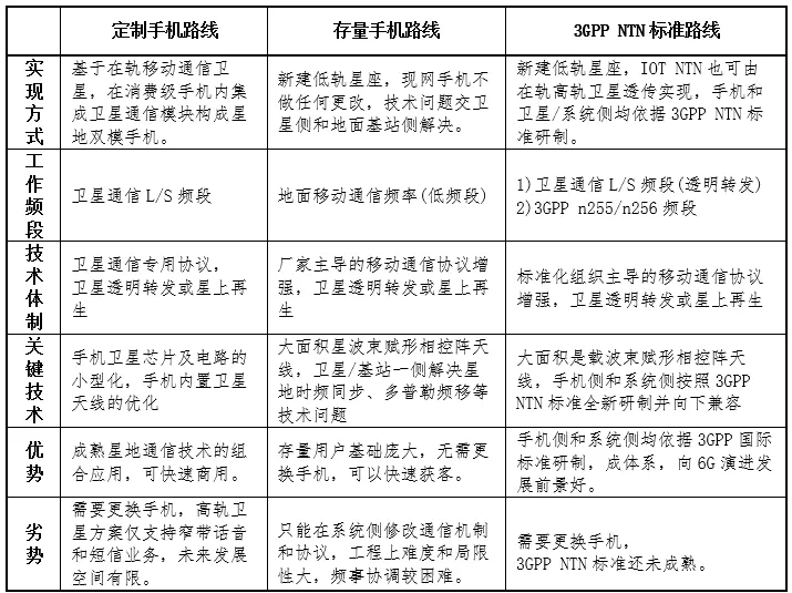 三种手机直连卫星技术体制优劣对比见下表所示。