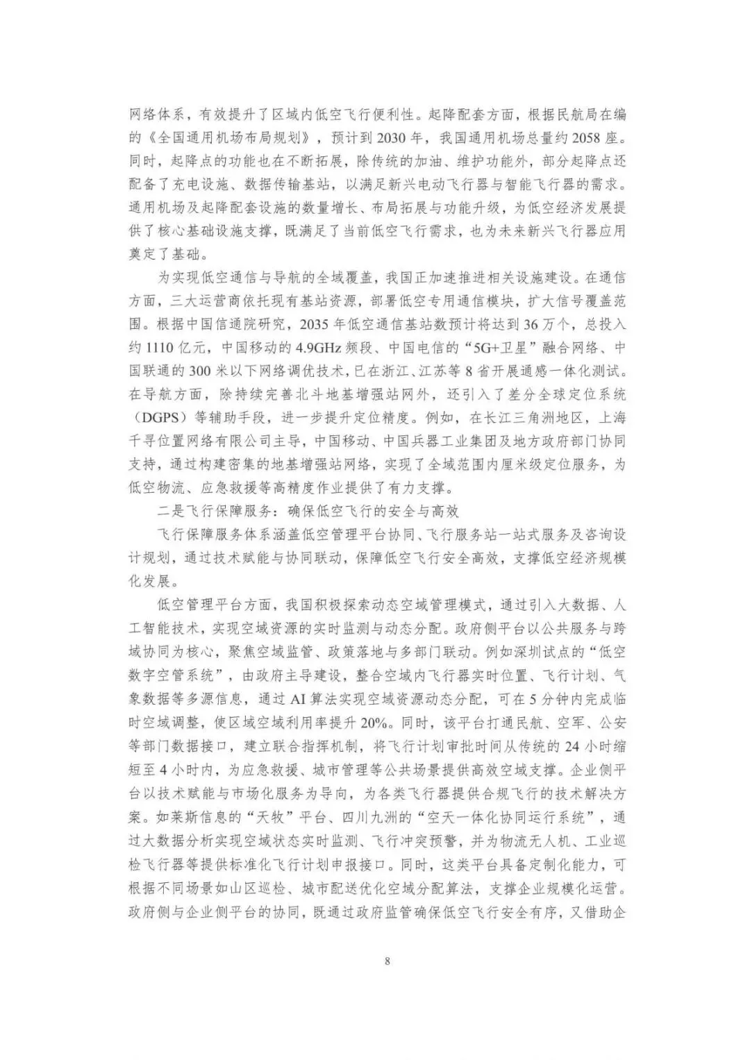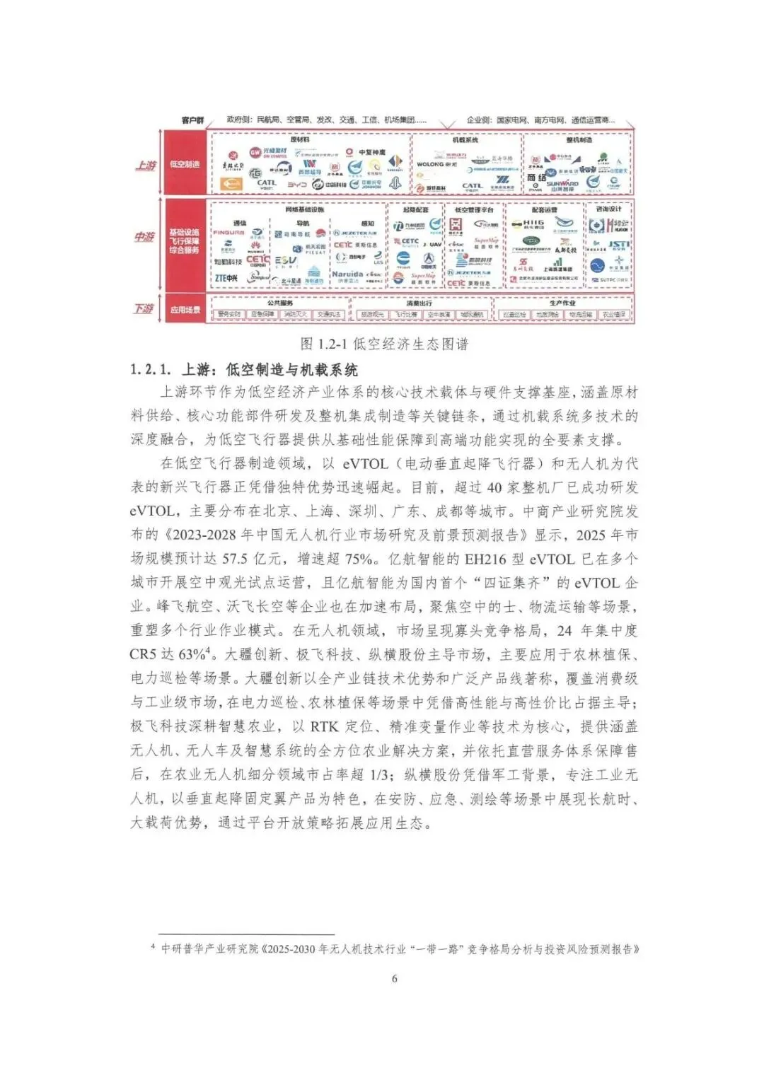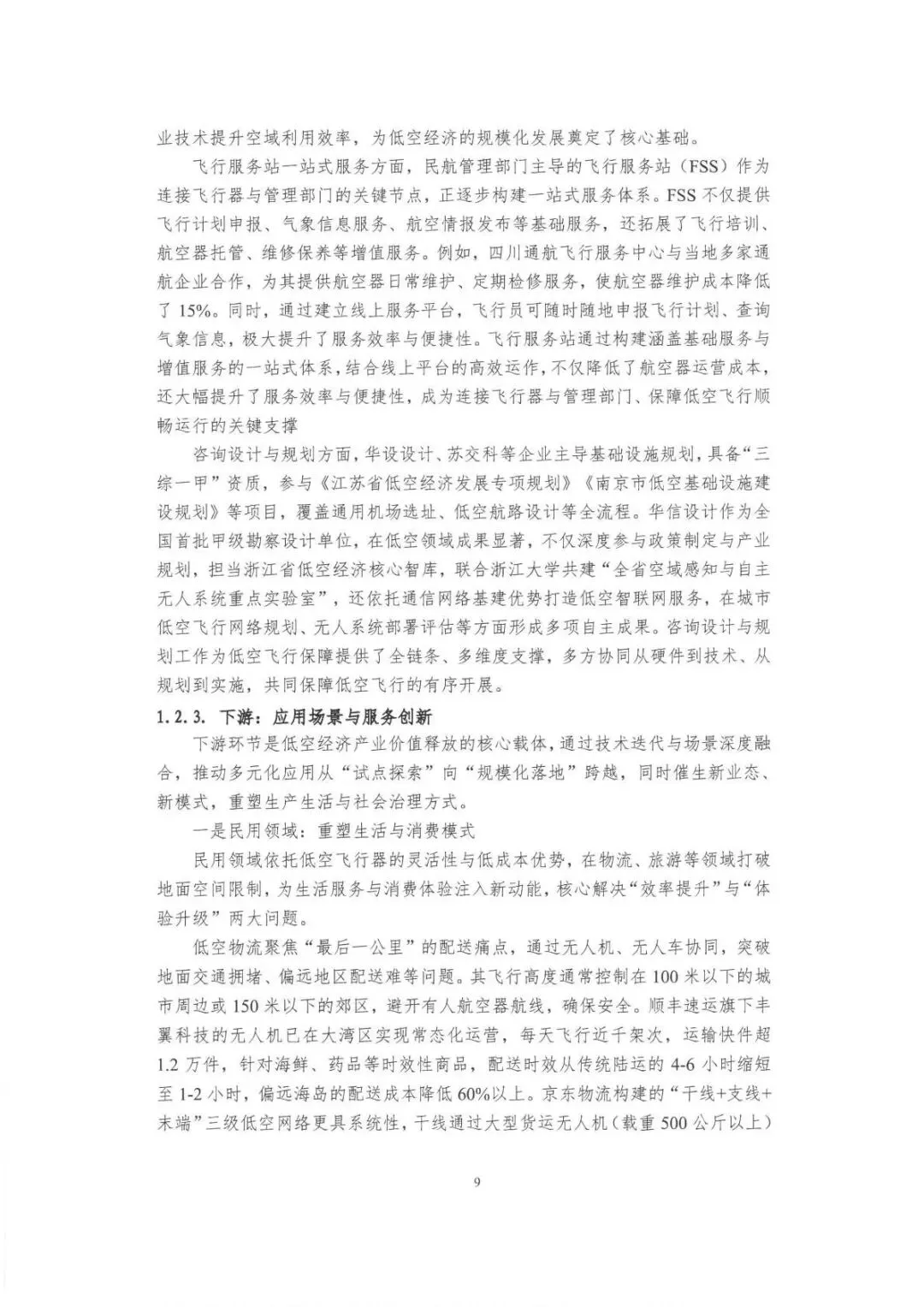 :低空经济已渗透应急救援、政务服务、文旅、物流等多领域。应急场景中,无人机快速投放救援物资、监测灾情;文旅领域,海南三亚 “海陆空” 立体旅游年接待超 10 万人次,带动周边消费增长;物流场景中,顺丰丰翼科技构建大湾区智慧物流枢纽,“最后一公里” 配送成本降低 60%。政府侧以公共服务为主,企业侧聚焦商业化运营,形成 “公共服务 + 商业应用” 双轮驱动格局。 - 商业模式创新适配产业发展阶段