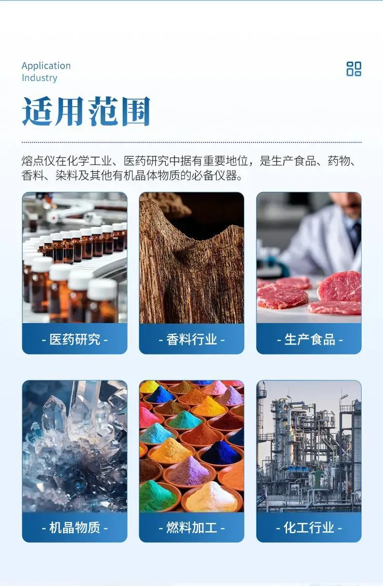 - 医药研究:药物晶体、有机中间体的熔点分析。