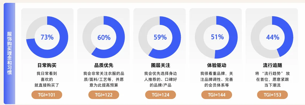 ⦁ 消费特征-高粘性高消费:近7成人观看服饰内容的频率提升,近70%的人年消费额增长,月均消费超500元。-消费态度:呈现“慢研究、快决策、重分享”的特点。购物前会深入研究,一旦认可价值则快速下单,并乐于向亲友分享。-社交驱动:69%的用户会购买网红/博主推荐的商品,将达人视为“品味信托”。亲友推荐和圈层认同是重要的决策助力。