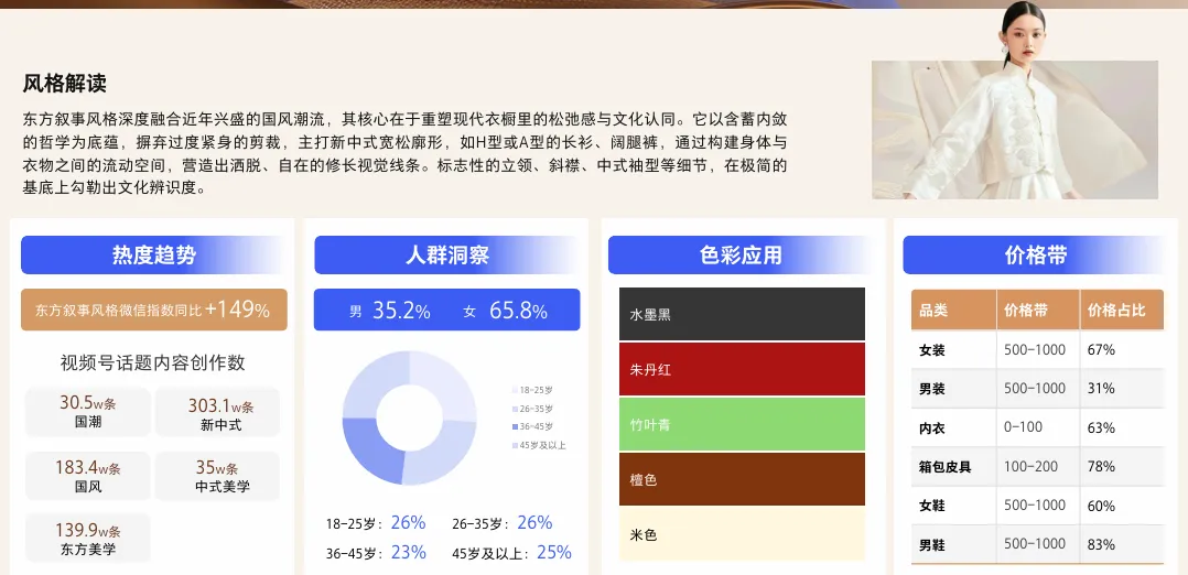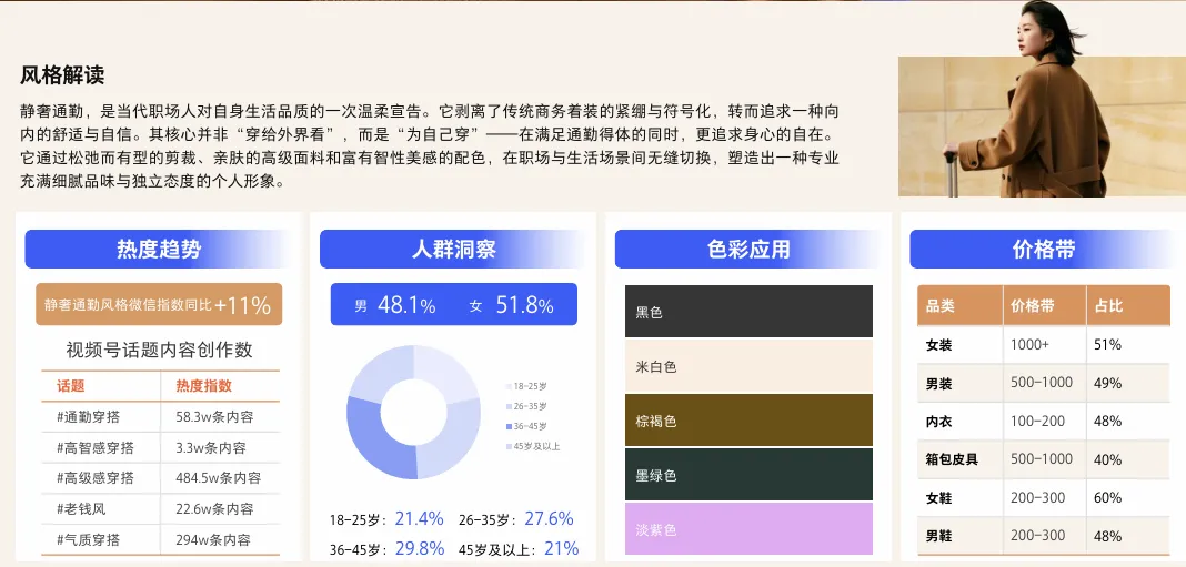⦁ 内容驱动消费:用户购买的不仅是商品,更是“美学的表达”、“品质的追求”、“功能的满足”和“场景的解决方案”。⦁ 趋势风向:女装流行“新中式”与“静奢风”;男装强调“版型面料”与“精英格调”;内衣追求“功能精研”与“舒适至上”;运动户外则融合“山系美学”与“情绪共鸣”。