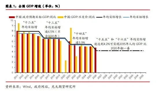 1.GDP增速目标:经济增长4.5%—5%,基本符合市场预期。报告指出,提出这些预期目标,主要考虑是开局之年为调结构、防风险、促改革留出空间,为到2035年人均国内生产总值比2020年翻一番、达到中等发达国家水平打好基础。要达到这个标准,“十五五”和“十六五”时期 GDP 需要年均增长4.17%。经济增长目标设为4.5%—5%,体现出2026年经济发展更加重提质增效。
