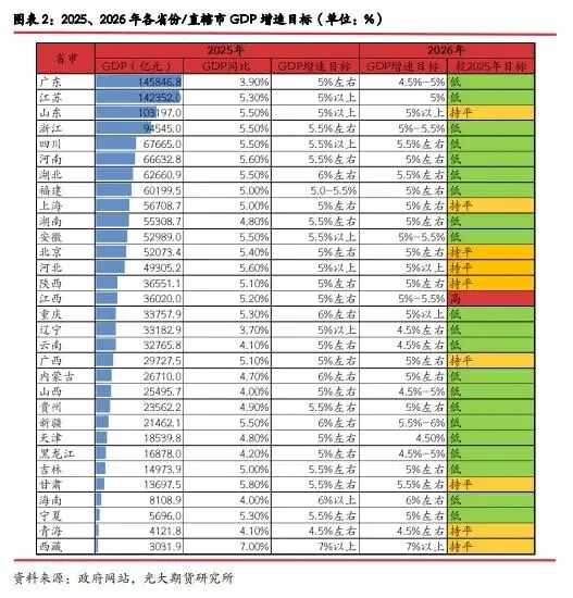 从地方两会来看,各省目标设定与前一年目标完成情况相关,2026年各省目标设定更加务实。地方政府工作报告显示,超过六成的地方调整了今年的经济增速预期目标,2026年GDP增速目标下调0.3个百分点;31省加权平均为5.0%,2025年为5.3%。近年31省GDP增速目标加权平均值一般比全国高0.3-0.4个百分点,据此推算,2026年全国GDP增速目标可能下调至4.5-5%,因此报告基本符合市场预期。