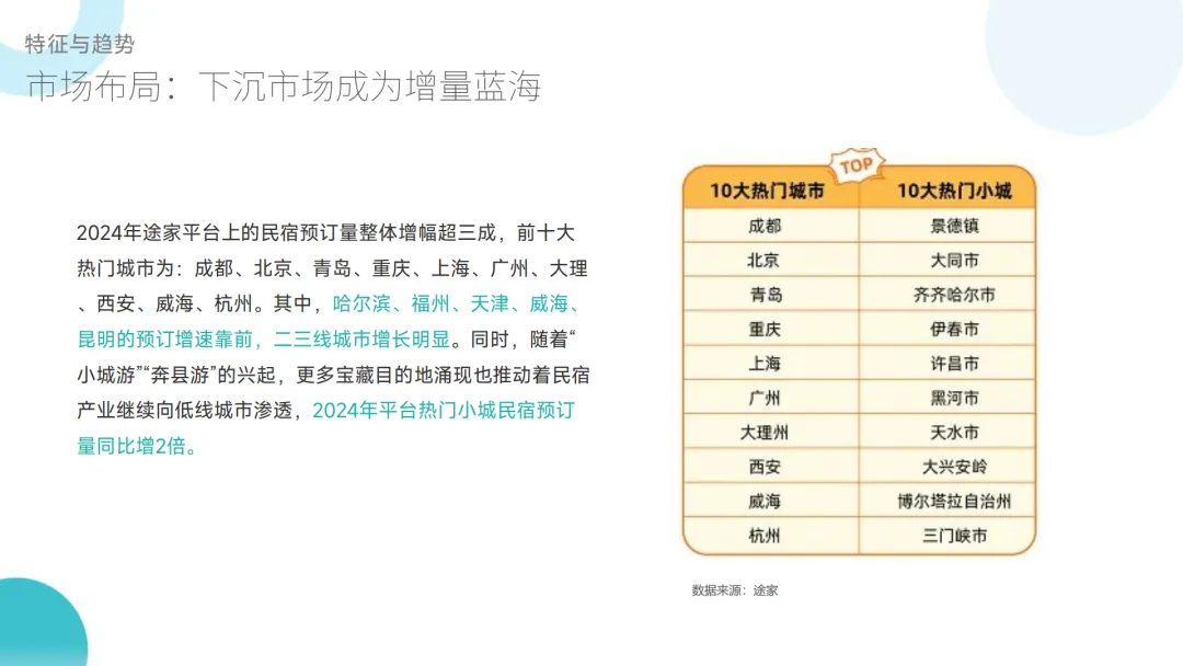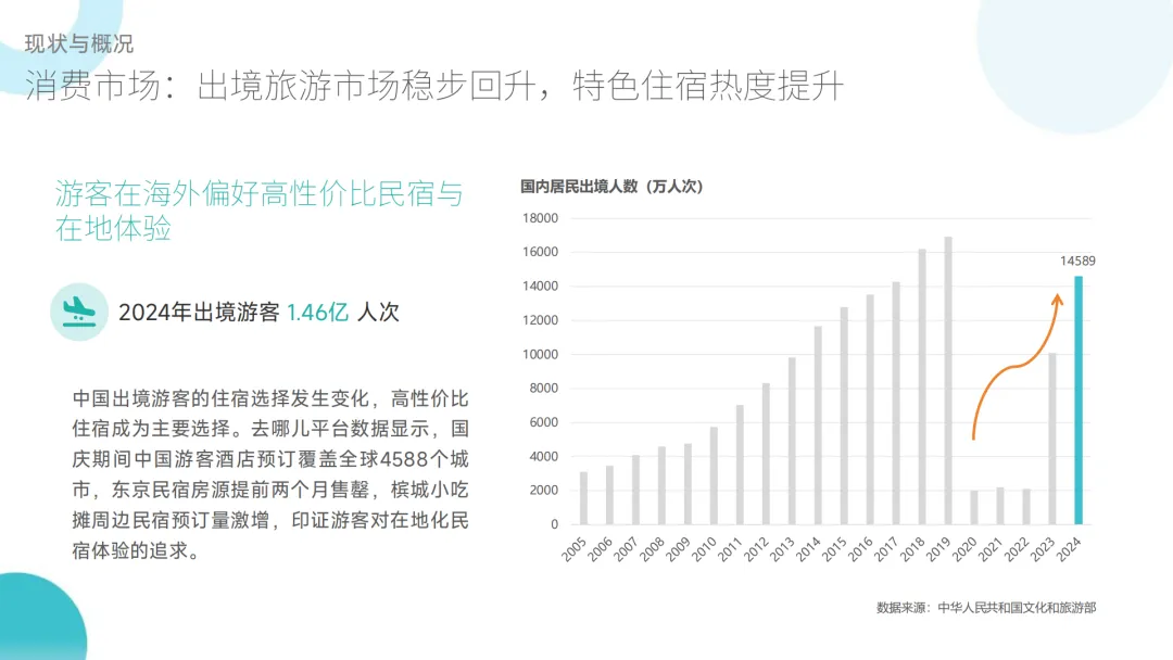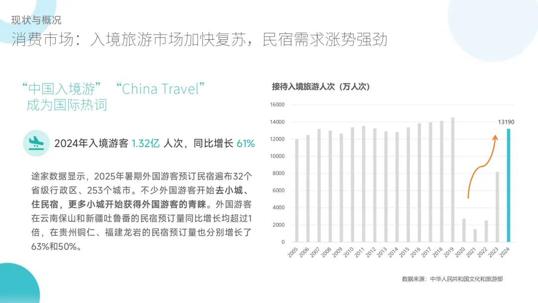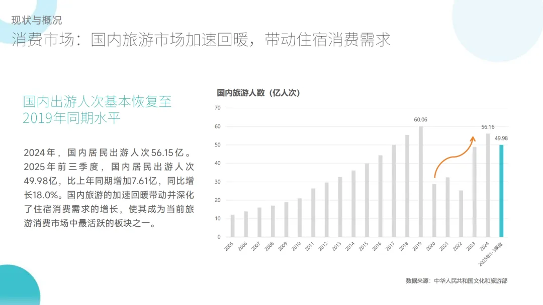:国内旅游出游人次基本恢复至 2019 年水平,2025 年前三季度达 49.98 亿(同比 + 18%);入境游民宿需求暴涨,云南保山、新疆吐鲁番等小城外国游客民宿预订量翻倍;出境游游客偏好高性价比在地化民宿,东京等目的地民宿房源紧俏。 - 供给端