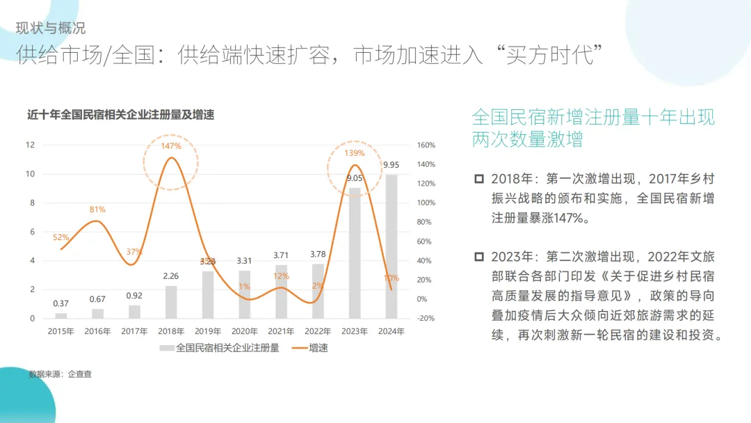 :全国民宿相关企业注册量近十年两次激增(2018 年乡村振兴、2023 年乡村民宿高质量发展政策驱动),2025 年前三季度全国新增 65125 家,广东、云南领跑;但市场进入 “买方时代”,省域发展分化,天津、宁夏等区域政策扶持欠缺。 - 投资经营