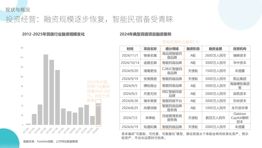 :融资规模逐步恢复,2024 年达 44.9 亿元创近七年新高,智能民宿成资本风口,资本偏好 “可复制、可托管、可数据化” 模式;但经营承压显著,2025 年 10 月全国民宿平均入住率 36%(同比 + 3%),平均房价 367 元(同比 - 30%),量增价跌导致盈利转向 “高周转微利润”。 - 政策与行业