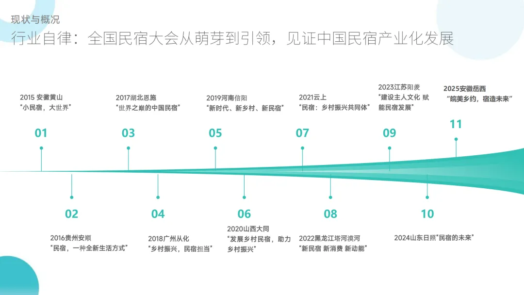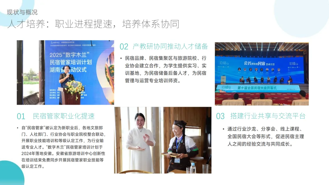 :国家政策历经 “追随 - 引导 - 体系化” 三阶段,浙江政策出台速度、密度全国第一;行业自律体系完善,全国有 435 家民宿行业社会组织,全国民宿大会成为产业发展重要平台;人才培养提速,“民宿管家” 职业化推进,产教研协同与行业交流平台逐步搭建。