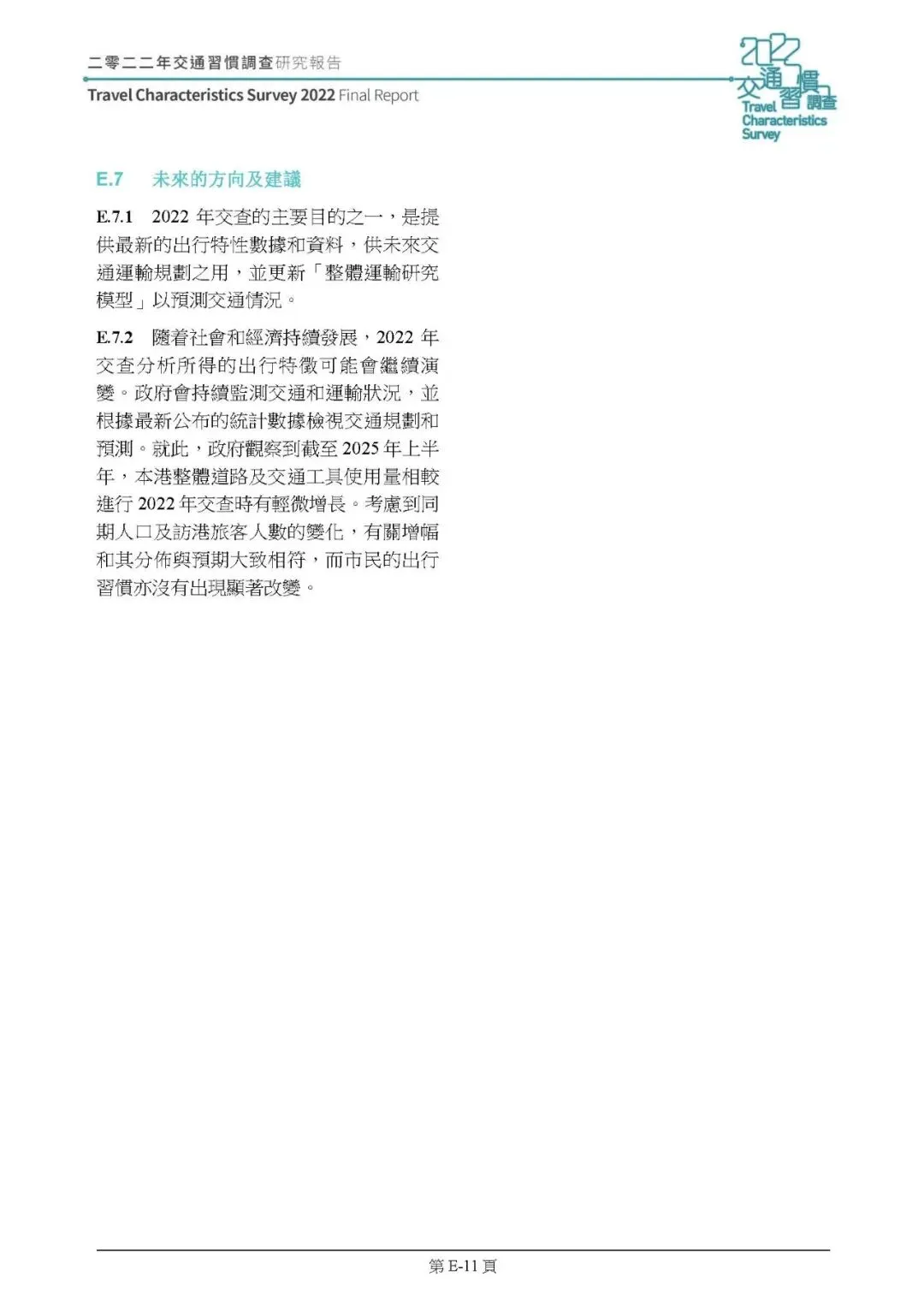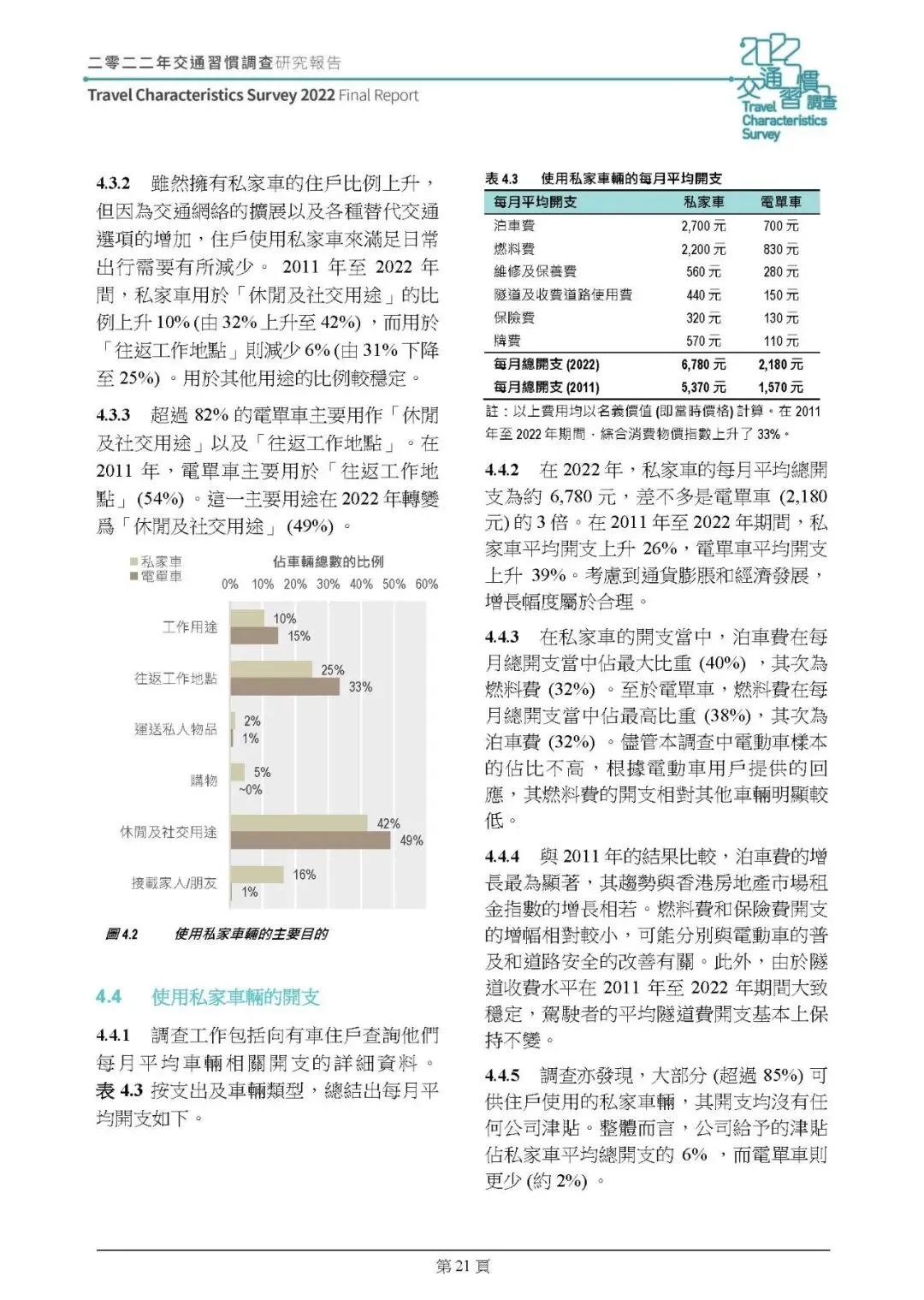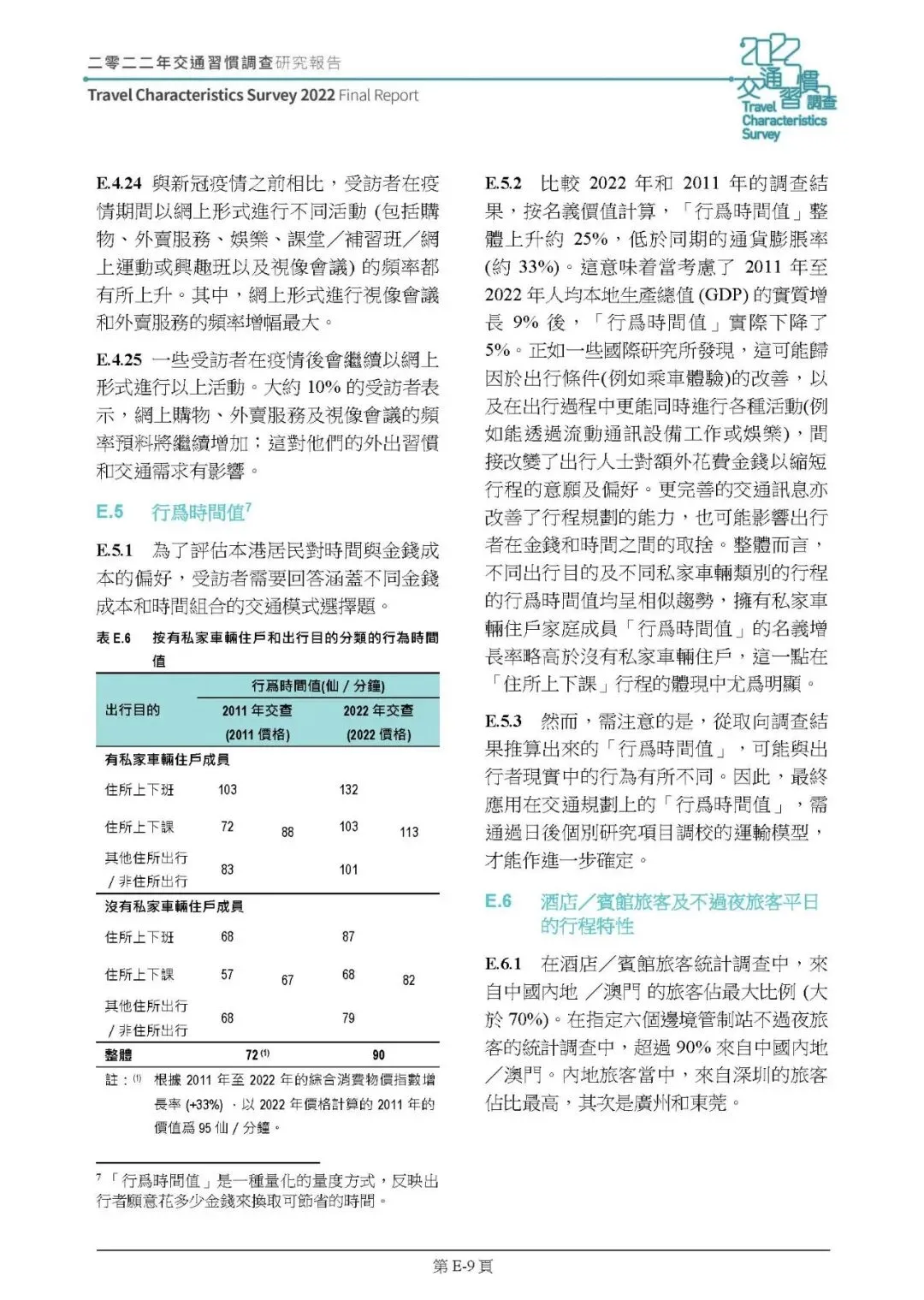 2022 年整体行为时间值为 90 仙 / 分钟,名义价值较 2011 年增 25%,但扣除 33% 的通胀率后实际降 5%;有私家車住戶的时间值比无車住戶高 28%-52%,上下班行程时间值最高。