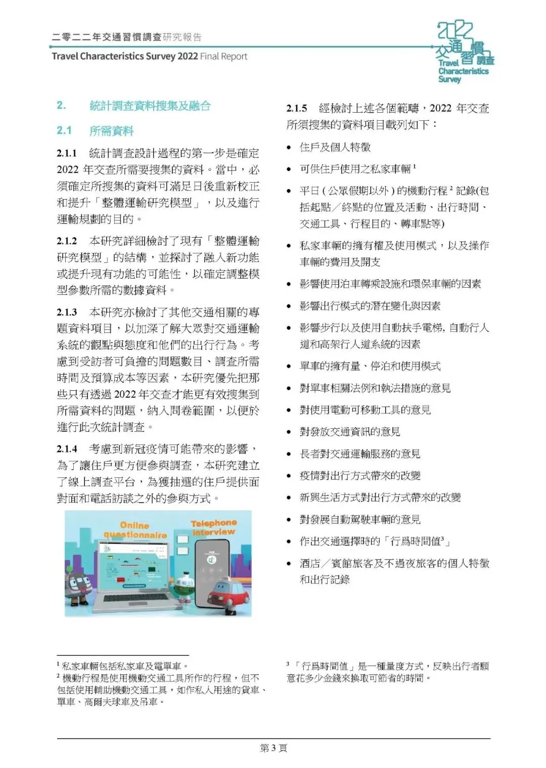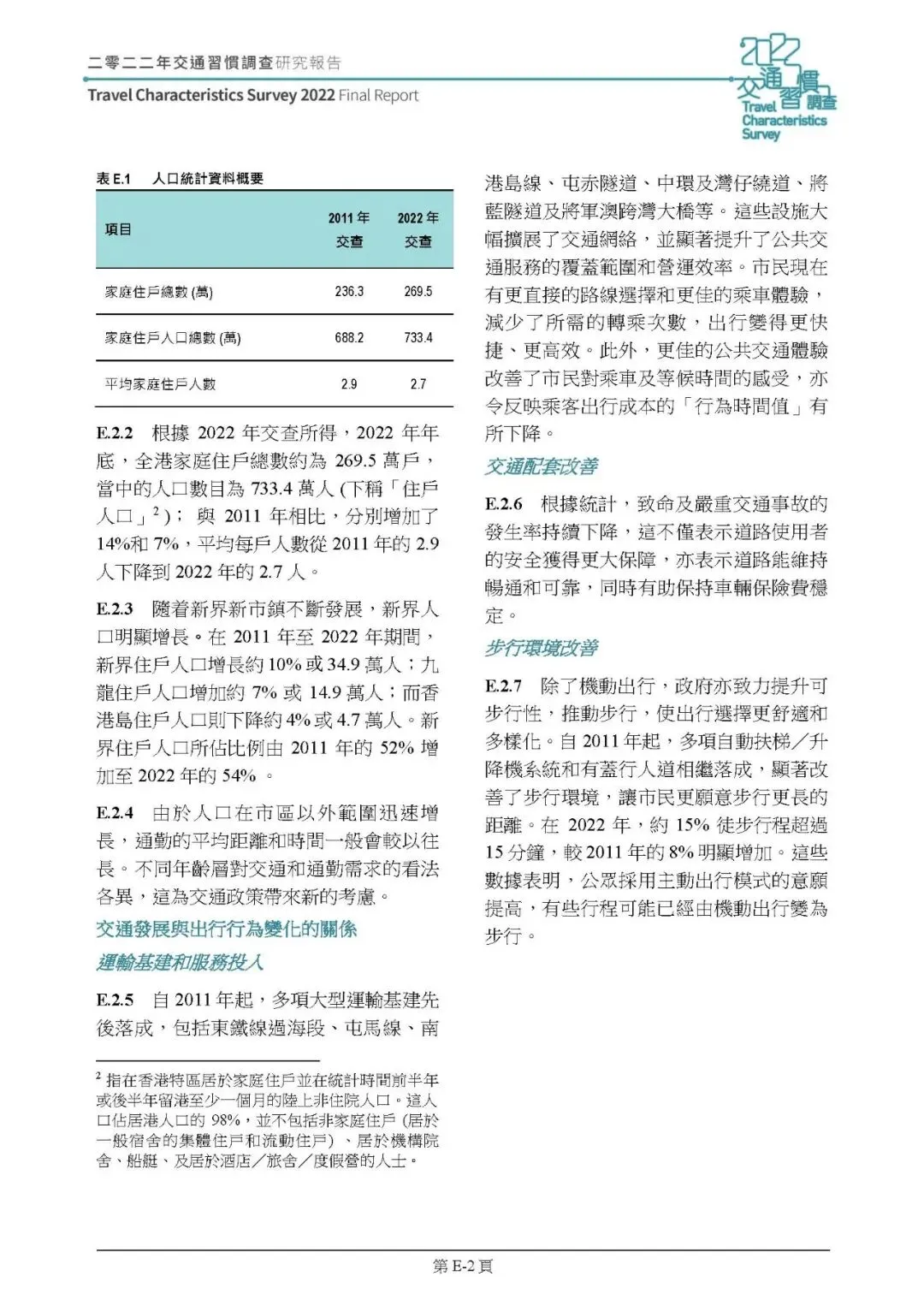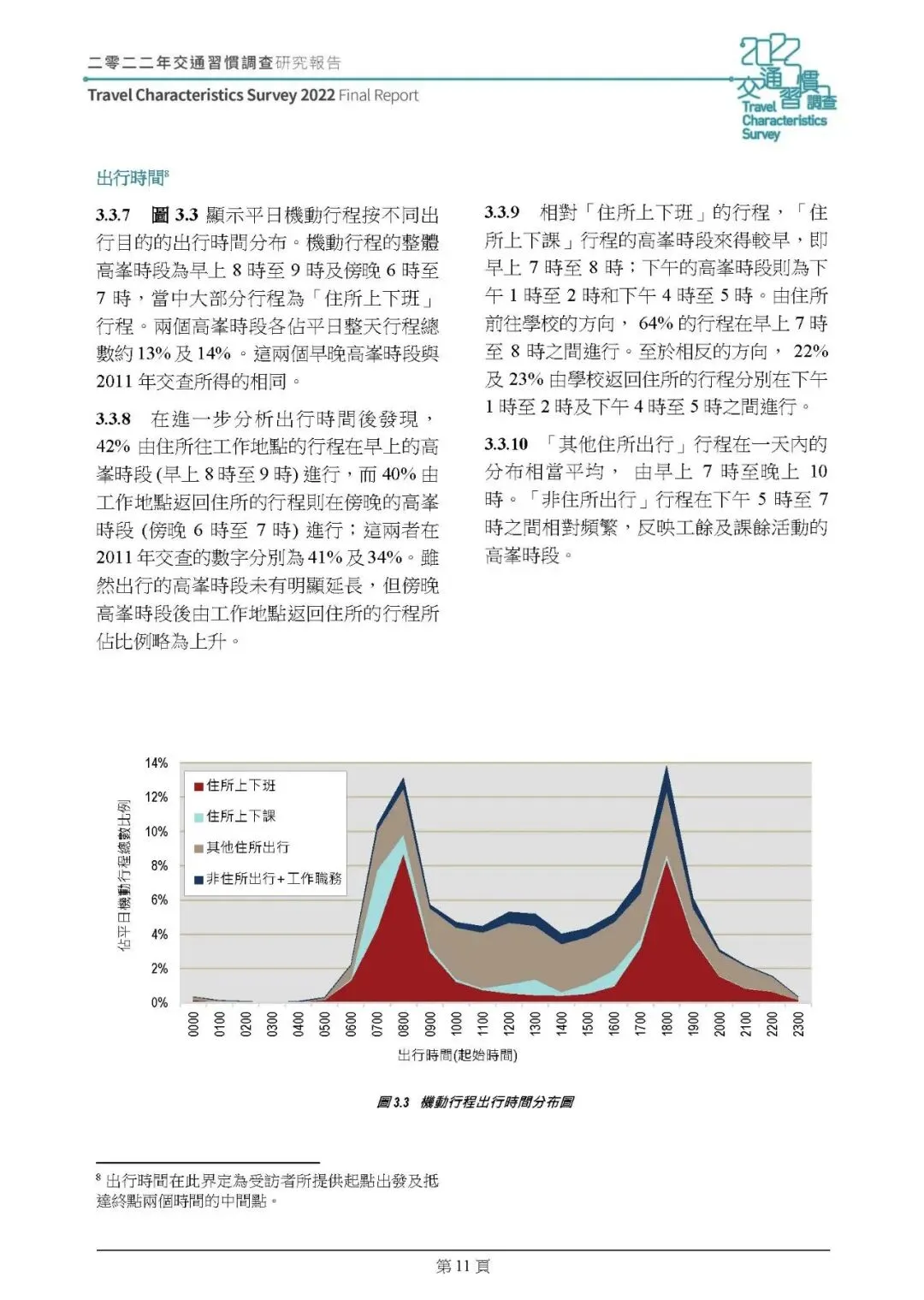 2022 年整体行为时间值为 90 仙 / 分钟,名义价值较 2011 年增 25%,但扣除 33% 的通胀率后实际降 5%;有私家車住戶的时间值比无車住戶高 28%-52%,上下班行程时间值最高。