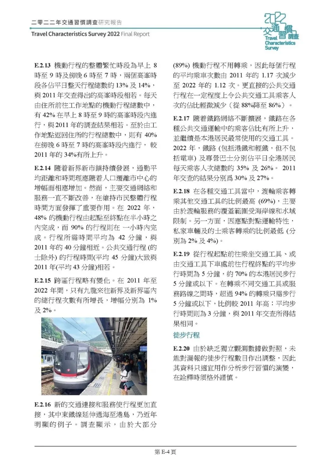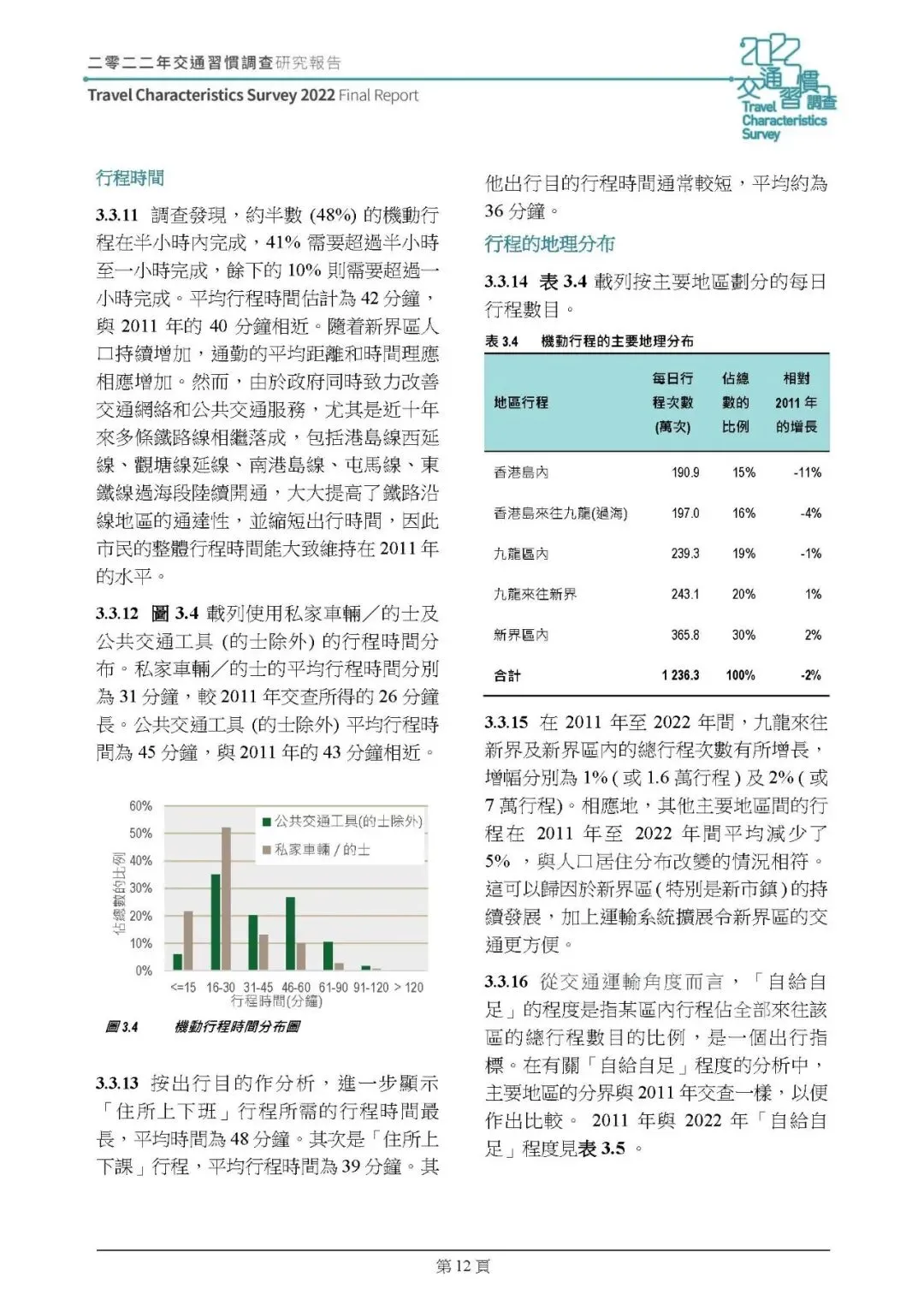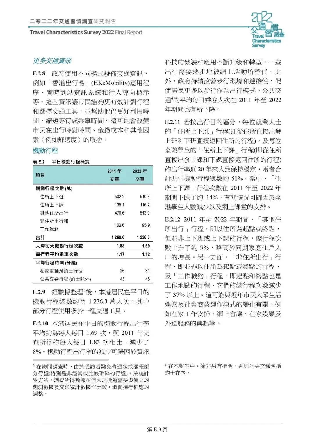 机动行程:2022 年平日机动行程总次数 1236.3 万人次,人均每日 1.69 次,较 2011 年降 8%;行程集中在早 8-9 时、晚 6-7 时,傍晚返程高峰集中度提升。通勤(上下班 / 上下课)仍占机动行程 51%,但上下课行程减 14%,工作职务行程减 37%,其他住所出行增 9%;平均行程时间 42 分钟,公共交通(的士除外)平均 45 分钟,私家車 / 的士 31 分钟;铁路占公共交通乘客人次 35%(2011 年 30%)成最主要交通工具,转乘率下降,89% 行程无需转乘。