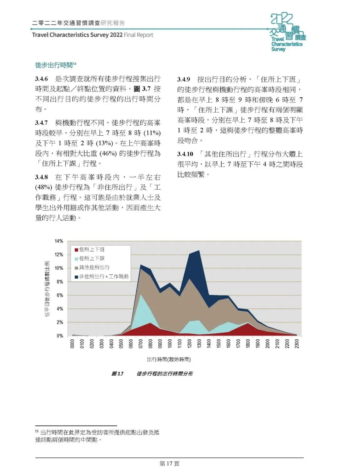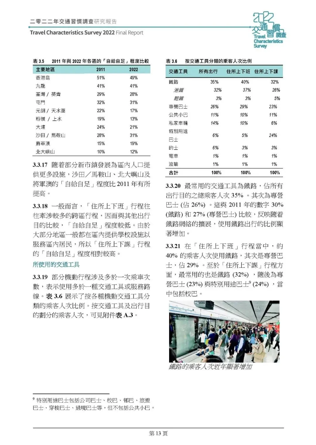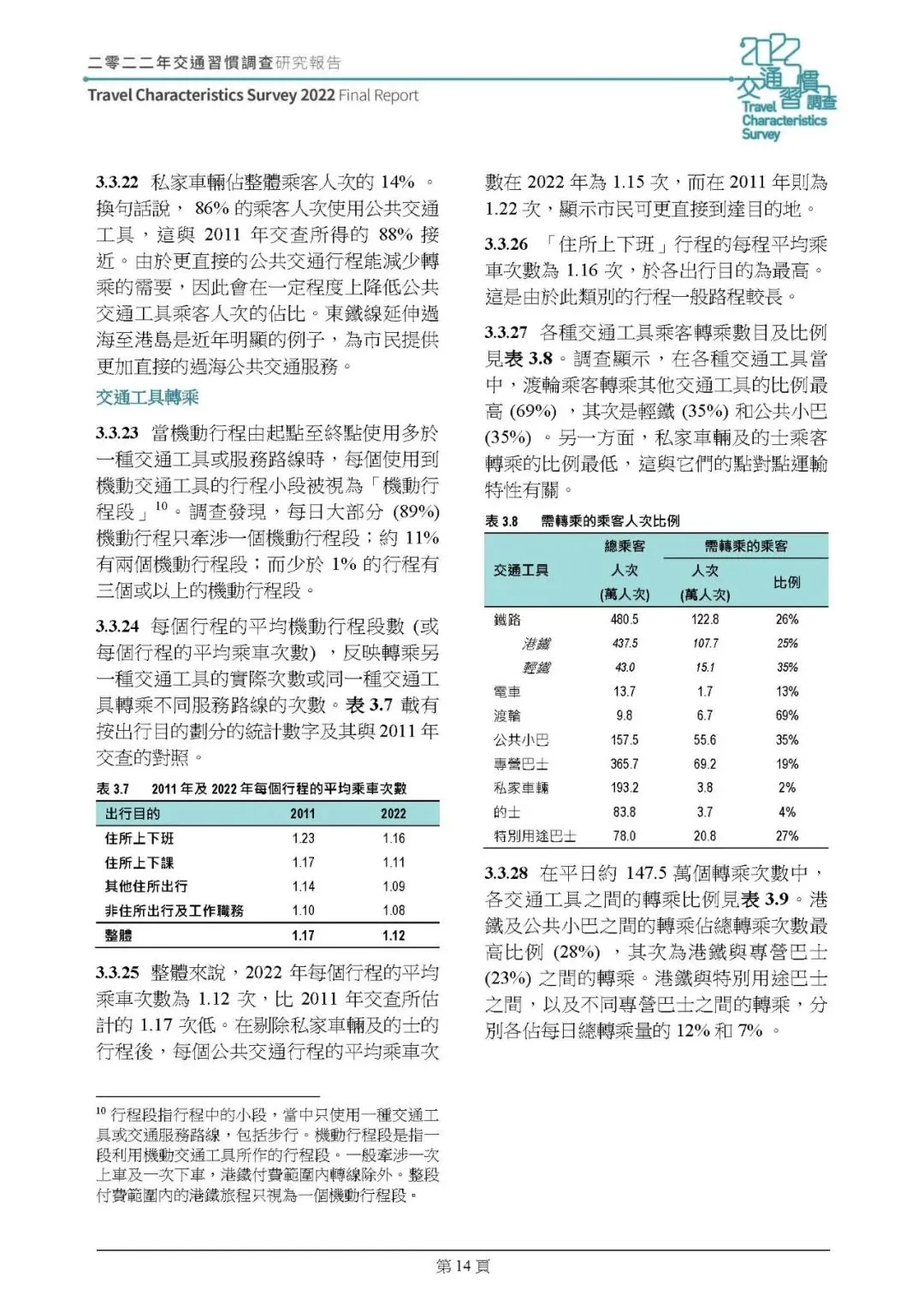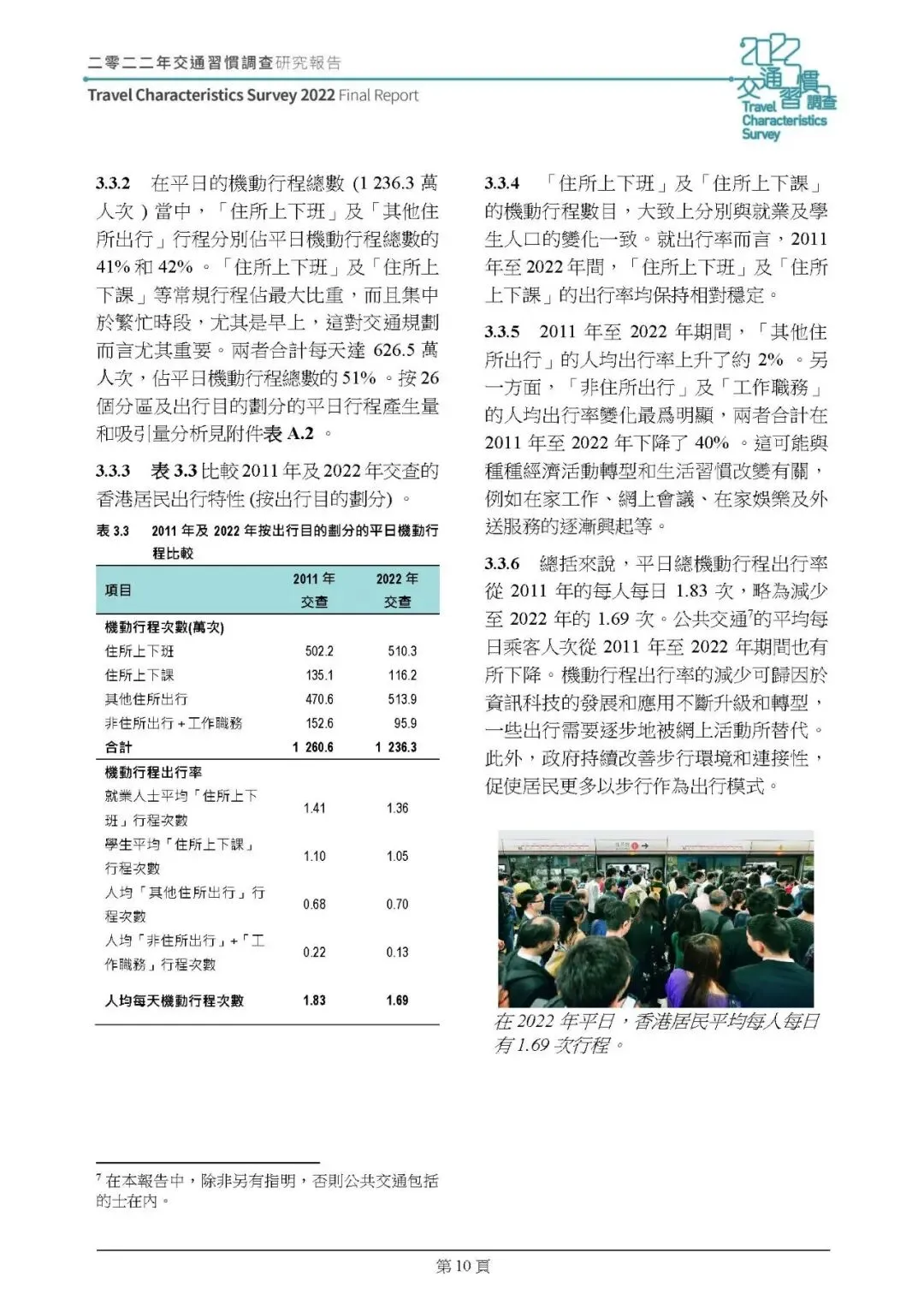 机动行程:2022 年平日机动行程总次数 1236.3 万人次,人均每日 1.69 次,较 2011 年降 8%;行程集中在早 8-9 时、晚 6-7 时,傍晚返程高峰集中度提升。通勤(上下班 / 上下课)仍占机动行程 51%,但上下课行程减 14%,工作职务行程减 37%,其他住所出行增 9%;平均行程时间 42 分钟,公共交通(的士除外)平均 45 分钟,私家車 / 的士 31 分钟;铁路占公共交通乘客人次 35%(2011 年 30%)成最主要交通工具,转乘率下降,89% 行程无需转乘。