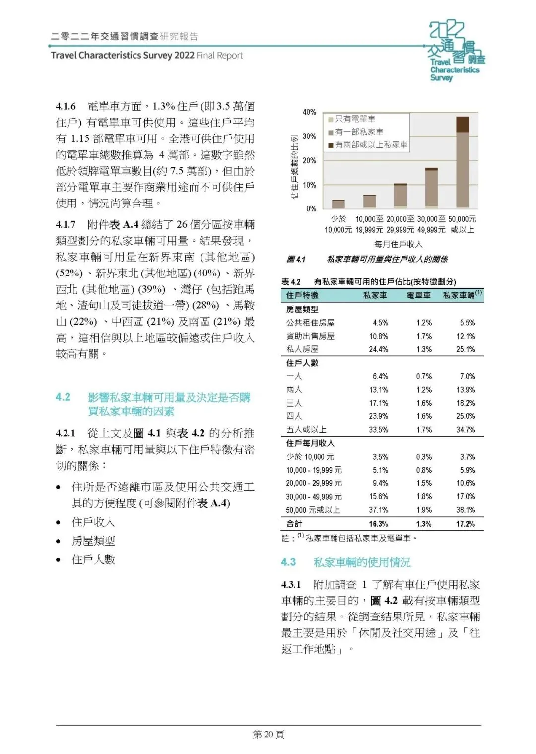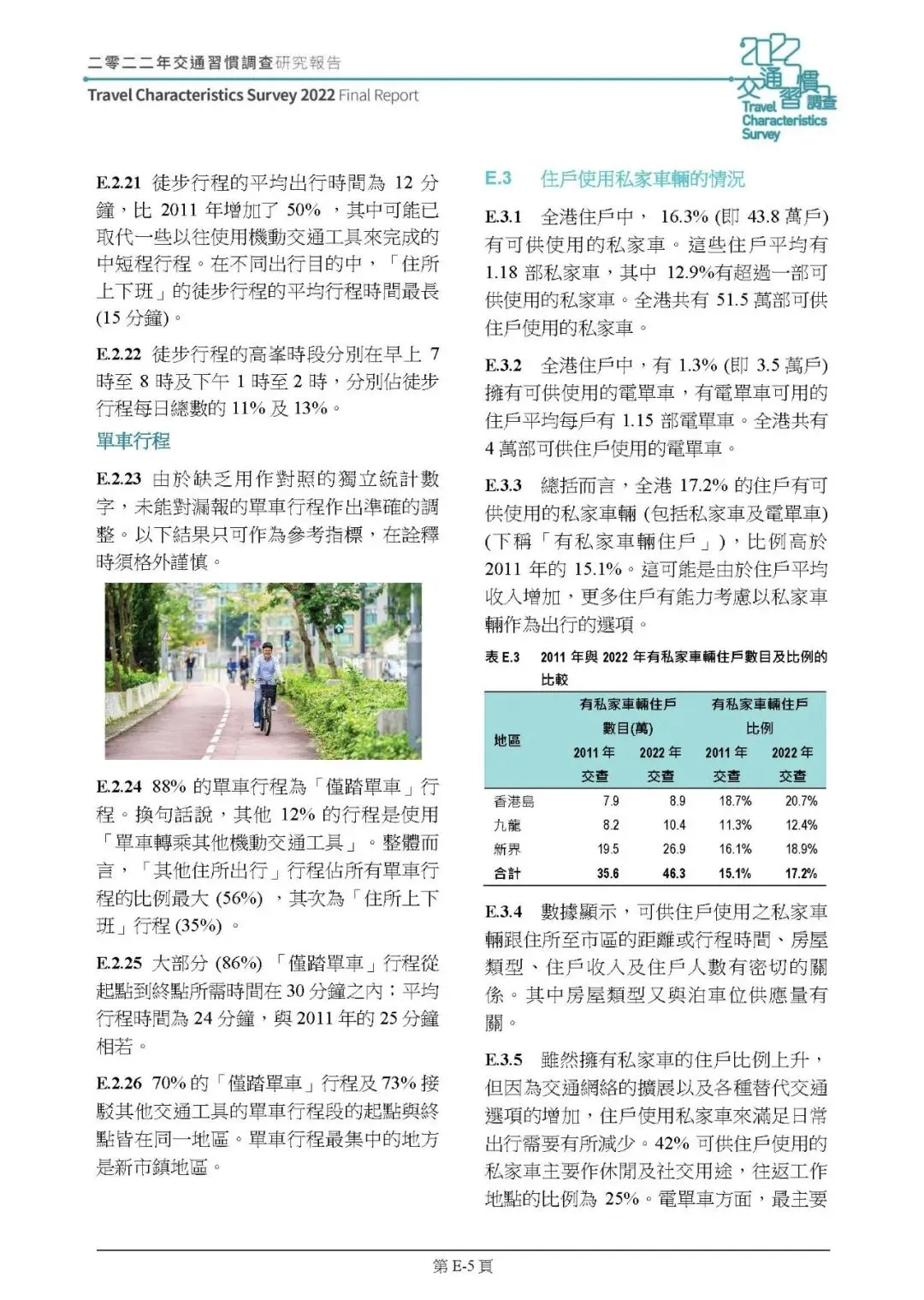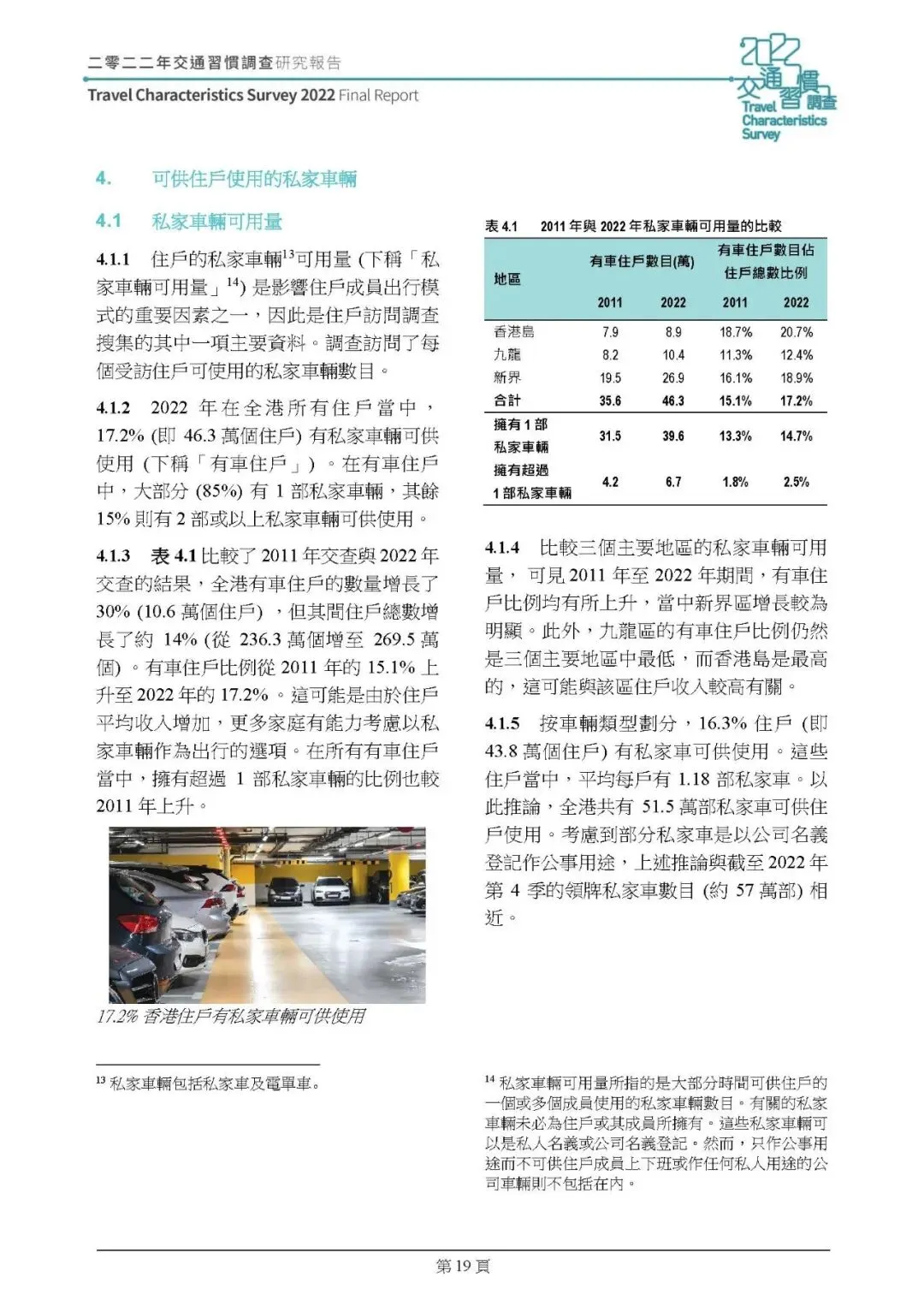保有量:2022 年 17.2% 住戶有私家車 / 电单车可用(2011 年 15.1%),全港约 51.5 万部私家車、4 万部电单车,新界有车住戶占比增幅最明显,住戶收入、房屋类型、戶籍人数是核心影响因素。