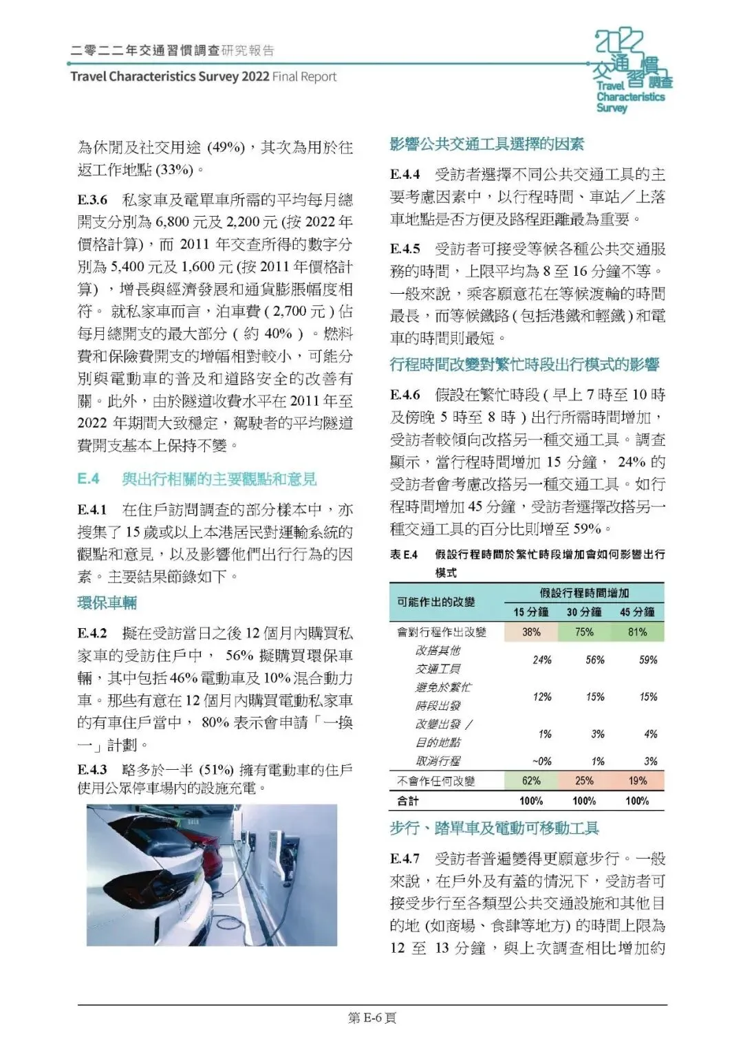 使用与开支:私家車主要用于休闲社交(42%),通勤占比降至 25%;电单车休闲社交用途占 49%,取代通勤成主要用途。私家車月均开支 6800 港元(泊车费占 40%)、电单车 2200 港元,较 2011 年随通胀合理增长;7% 有车住戶拥有电动车,51% 靠公共停车场充电,环保、节省费用是购买电动车主因。