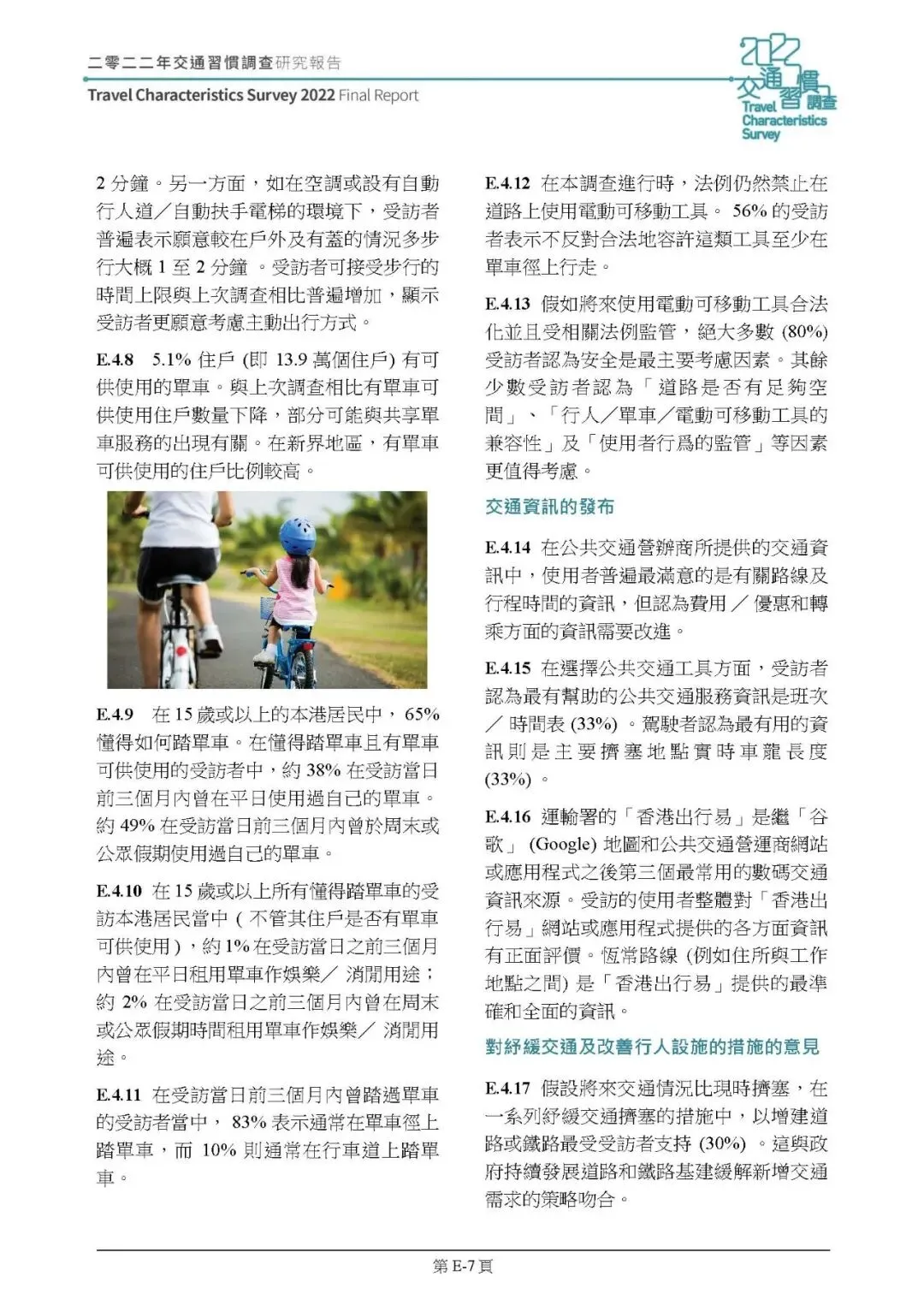 步行与单车:市民可接受步行至公共交通设施的时间上限升至 12-13 分钟,空调 / 自动行人道环境下意愿更高;5.1% 住戶有单车可用,65% 居民会踏单车,83% 单车使用者在单车径骑行,77% 受访者支持强制佩戴单车头盔。