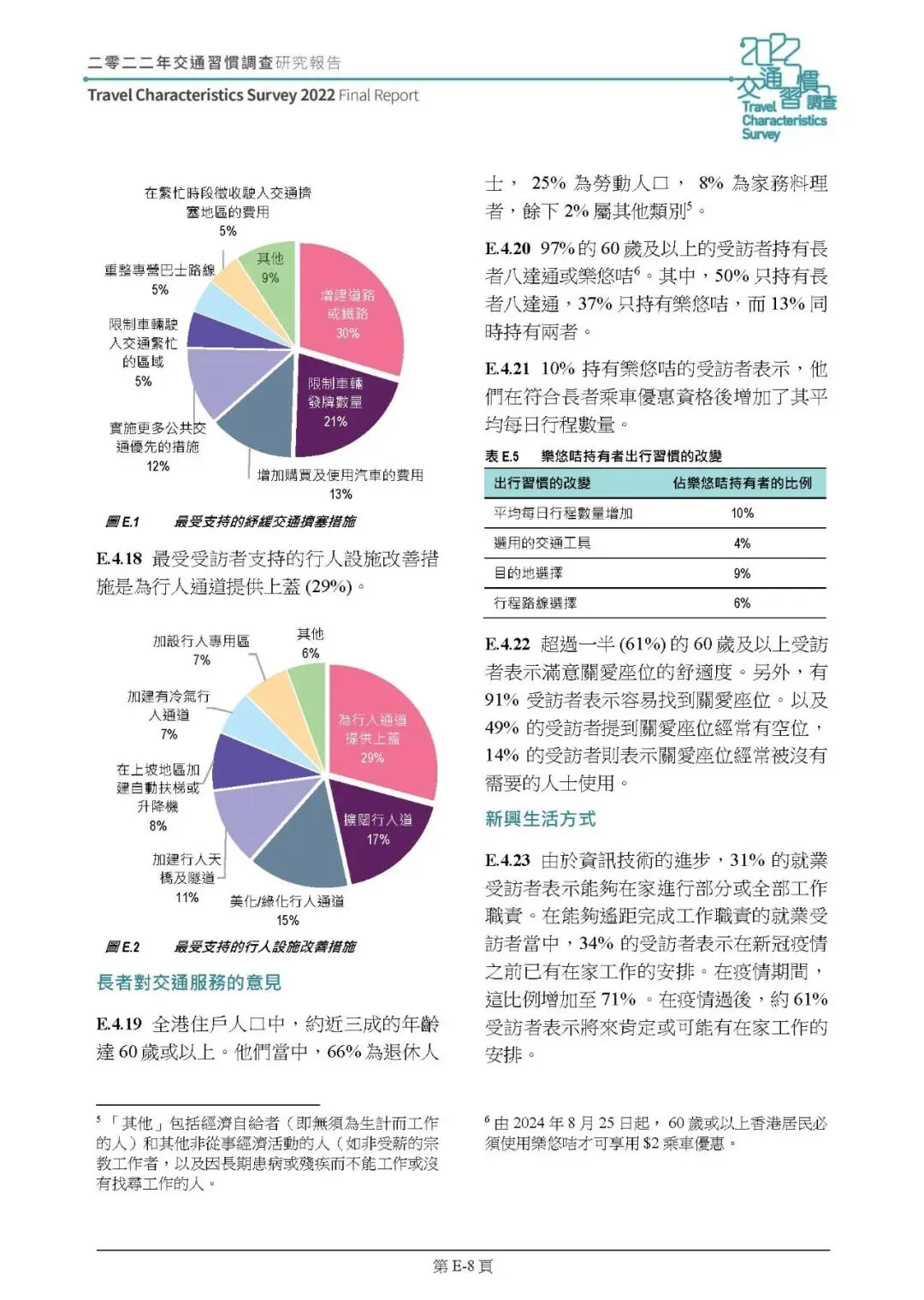 交通改善诉求:30% 受访者支持增建道路 / 铁路纾缓拥堵,29% 支持为行人通道加设上盖;长者最关注行人天桥 / 隧道升降设施不足、过马路绿灯时间太短等问题。