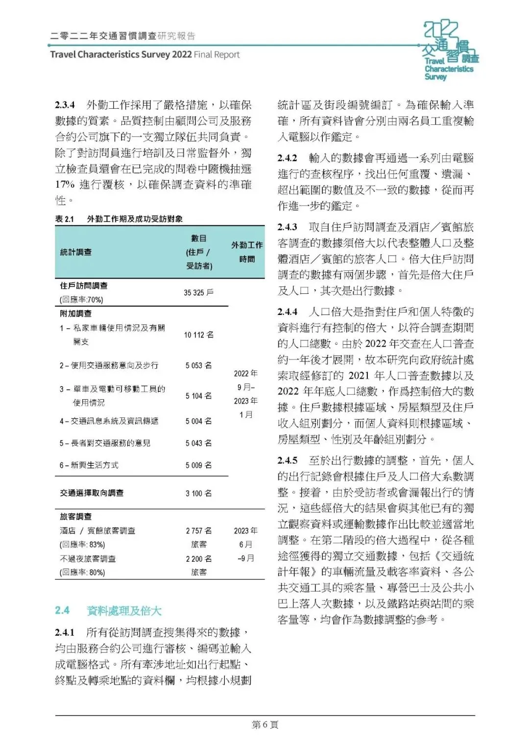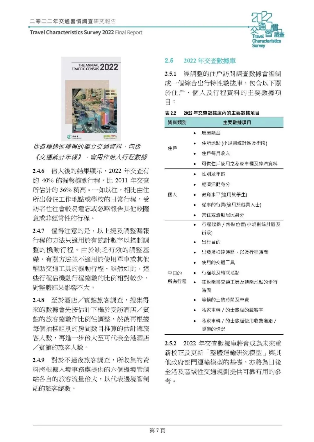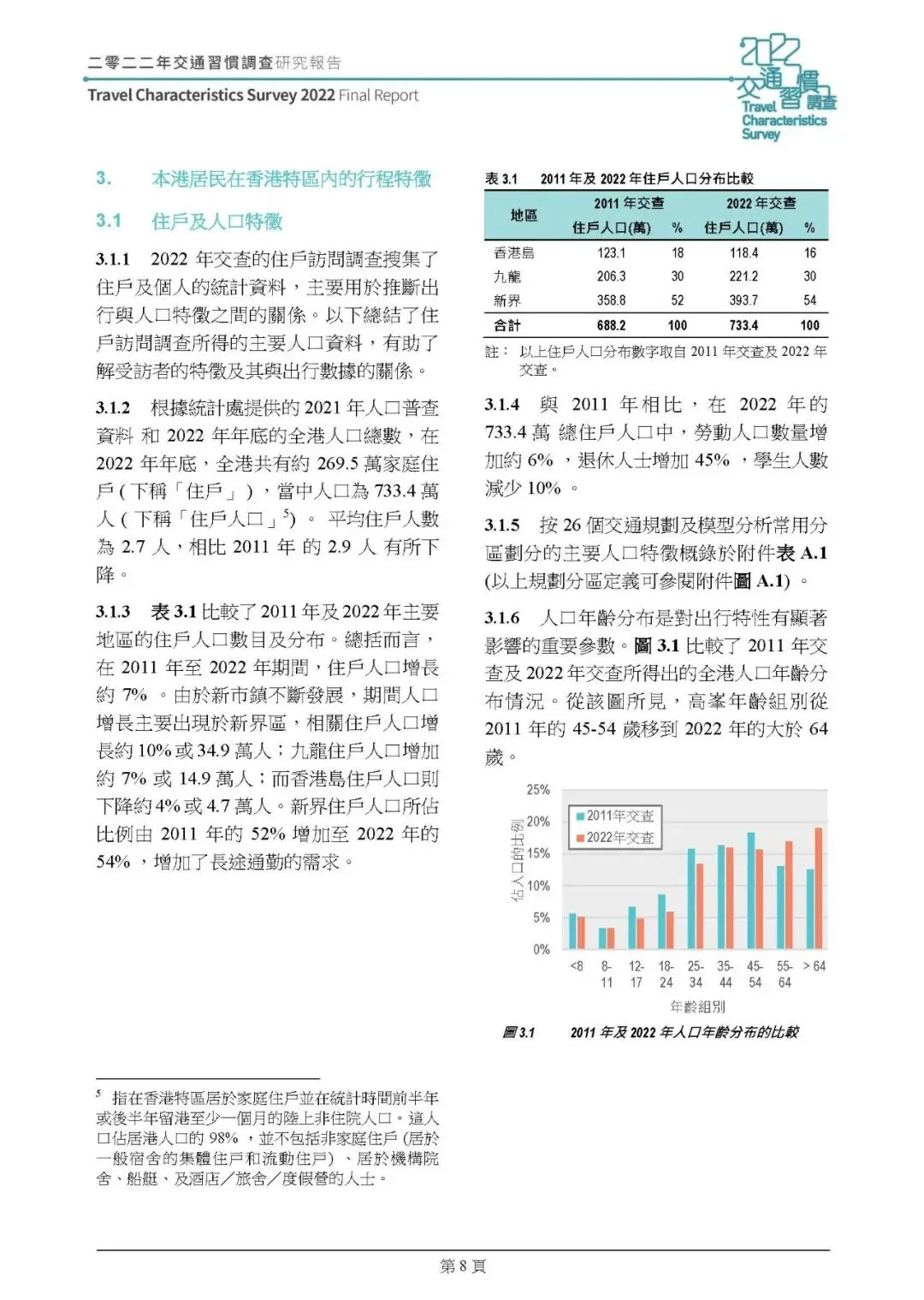 这份由 ARUP 编制的《2022 年香港交通习惯调查研究报告(2025 年版本)》,是继 2011 年后香港又一次全港性交通习惯调查,调查分 2022 年 9 月 - 2023 年 1 月的住戶及交通选择取向调查、2023 年 6-9 月的旅客调查两个阶段开展,通过住戶访问、交通选择取向、旅客统计三类调查,结合数据倍大与校正,分析了香港居民及访港旅客的出行特征、私家车辆使用情况、市民出行相关意见等,为香港交通规划和运输模型更新提供核心数据支撑,核心总结如下: