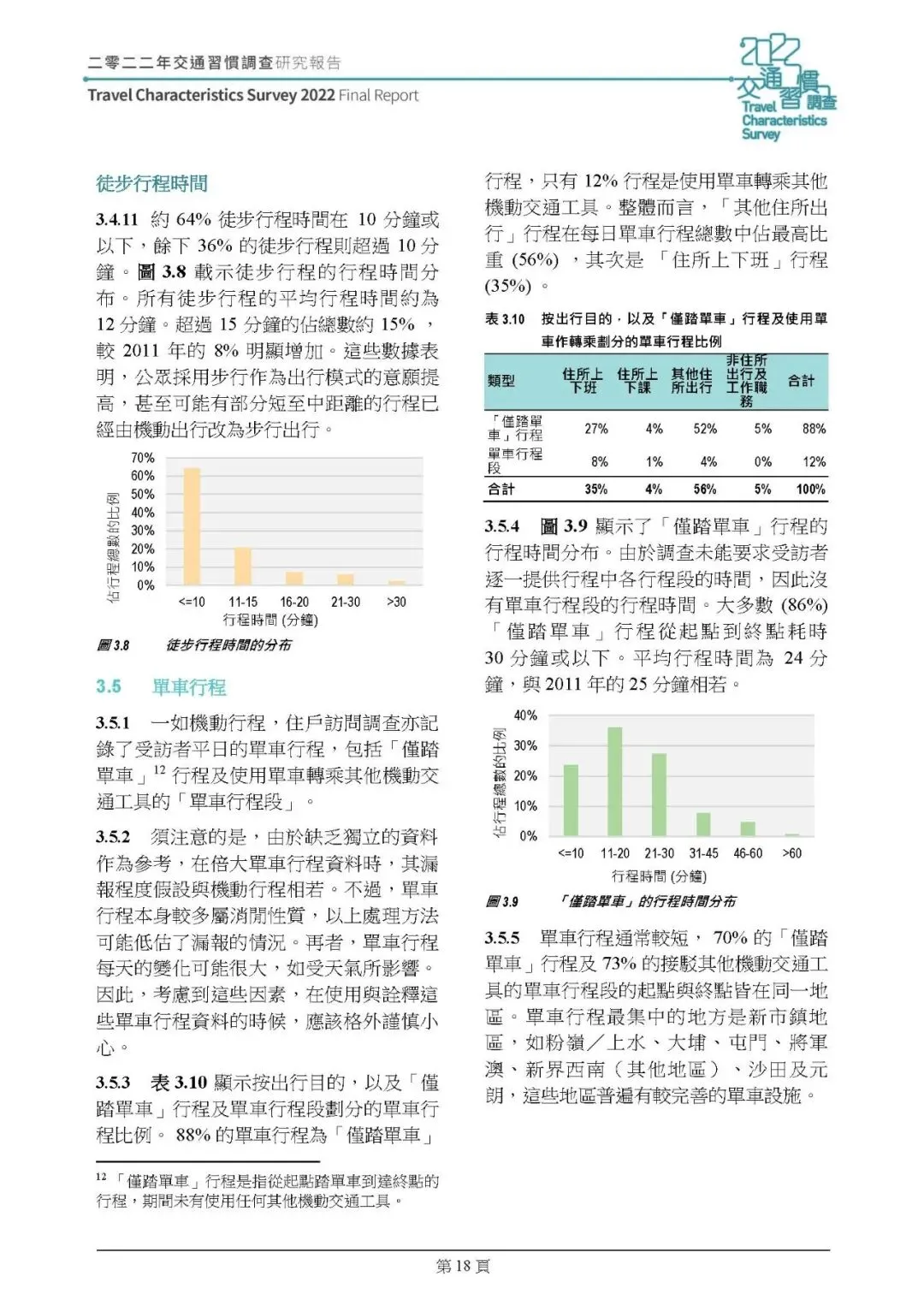 主动出行:步行环境改善推动步行意愿提升,2022 年 15% 徒步行程超 15 分钟(2011 年 8%),平均步行时间 12 分钟,较 2011 年增 50%;单车行程以 “仅踏单车” 为主(88%),集中在新界新市鎮,主要用于休闲和上下班,平均行程时间 24 分钟。