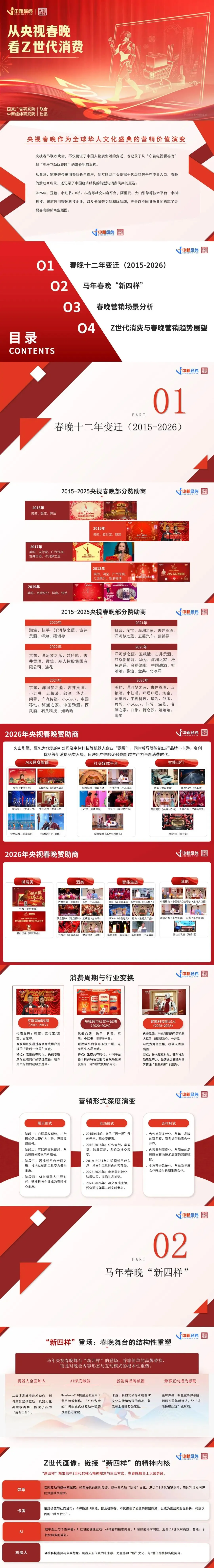 《报告》指出,从白酒、家电等传统消费品长年霸屏,到互联网巨头豪掷十亿级红包争夺流量入口,春晚的赞助商名录,记录了中国经济结构的转型与消费风尚的更迭。