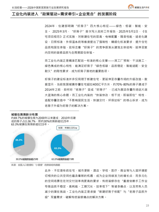 近日,树懒研究《长效经营—2026中国家居家装行业发展研究报告》发布,一份关于行业转型的清晰图景缓缓展开:“增量扩张”向“存量提质”转变,供强需弱、同质化竞争等压力交织,“好房子”建设、以旧换新、工业化内装与AI应用,正成为破局长效经营的核心抓手,工业化内装进入“政策驱动+需求牵引+企业竞合”的加速发展阶段,成为“好房子”建设的核心支撑。