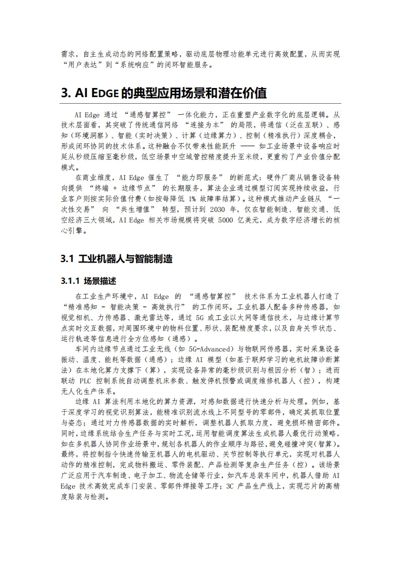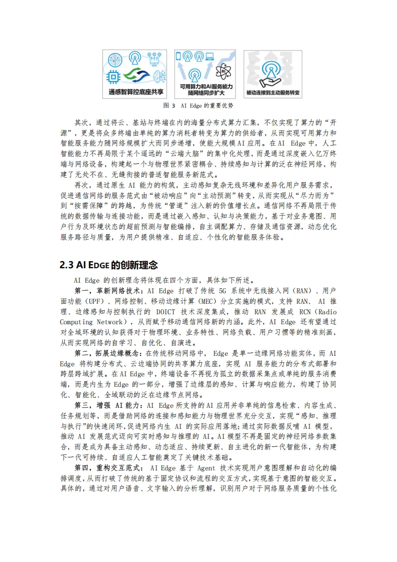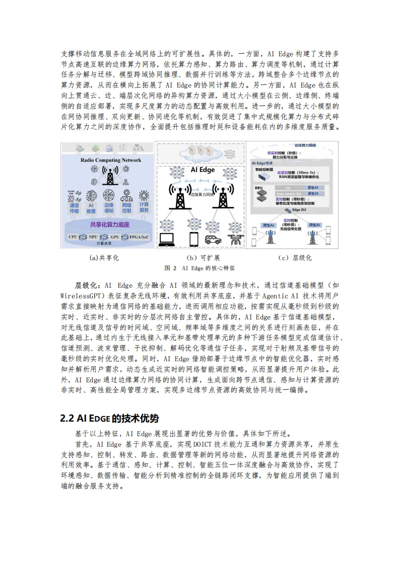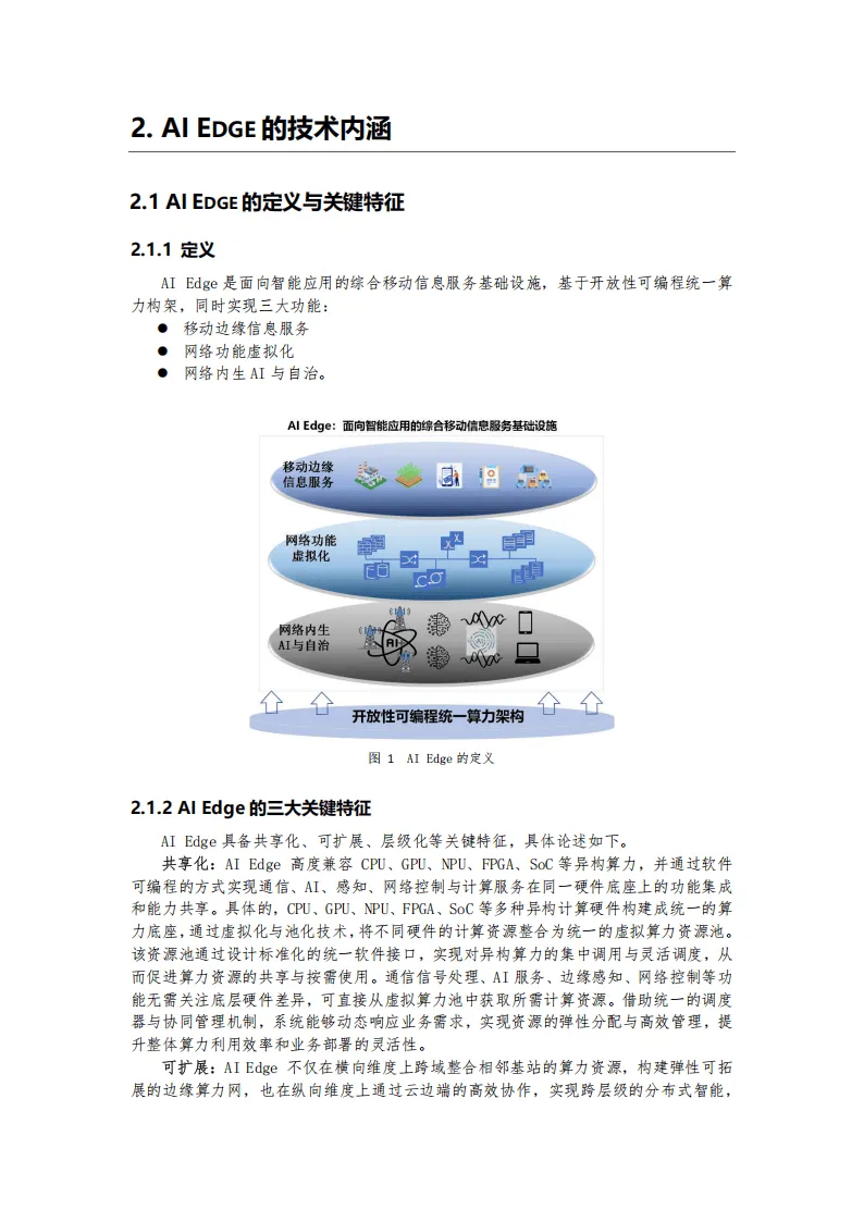 白皮书由AI Edge联盟发布,立足DOICT深度融合的产业技术背景与6G通智融合的发展趋势,系统阐释了AI Edge的技术内涵、应用价值与核心技术方向,为边缘智能与通信网络融合发展提供了全面框架。AI Edge作为面向智能应用的综合移动信息服务基础设施,基于开放性可编程统一算力架构,实现移动边缘信息服务、网络功能虚拟化、网络内生AI与自治三大核心功能,具备共享化、可扩展、层级化关键特征,能实现DOICT能力互通与算力资源共享,推动网络服务从被动响应向主动预测转变,构建泛在智能服务新范式。