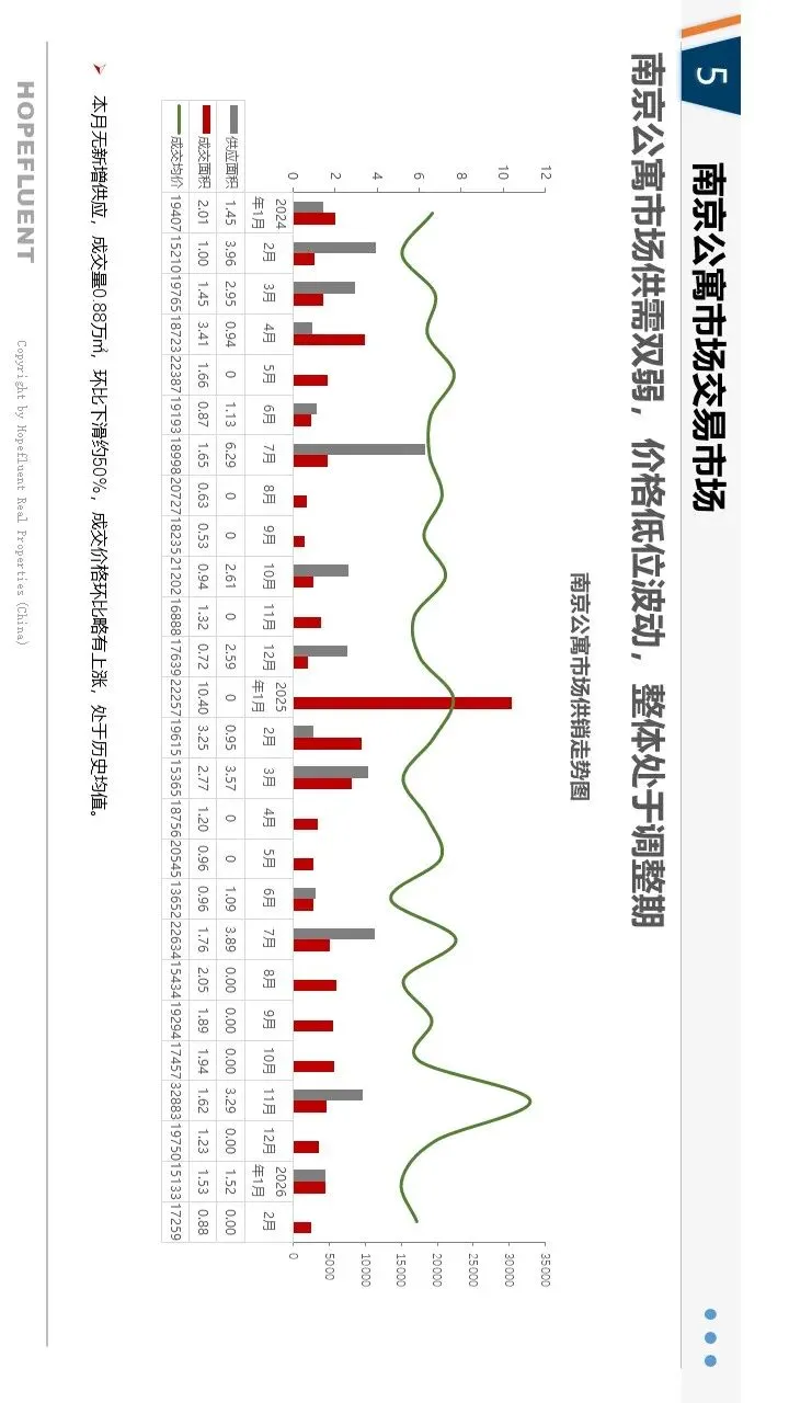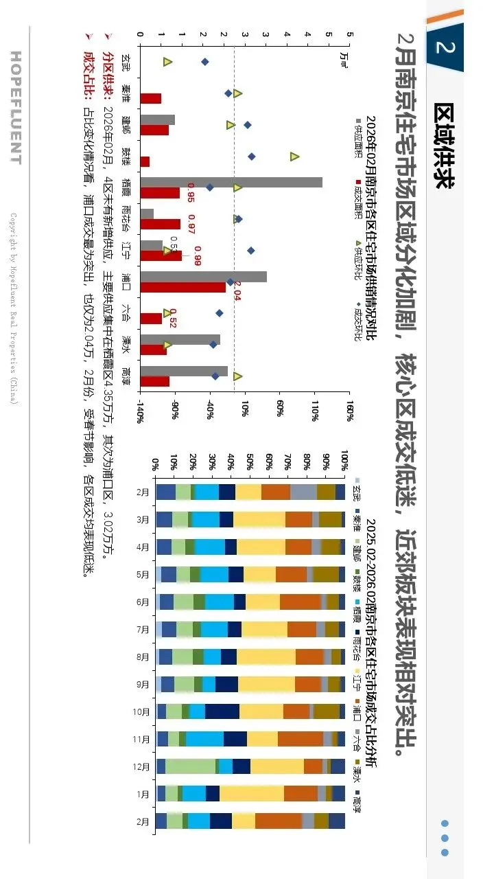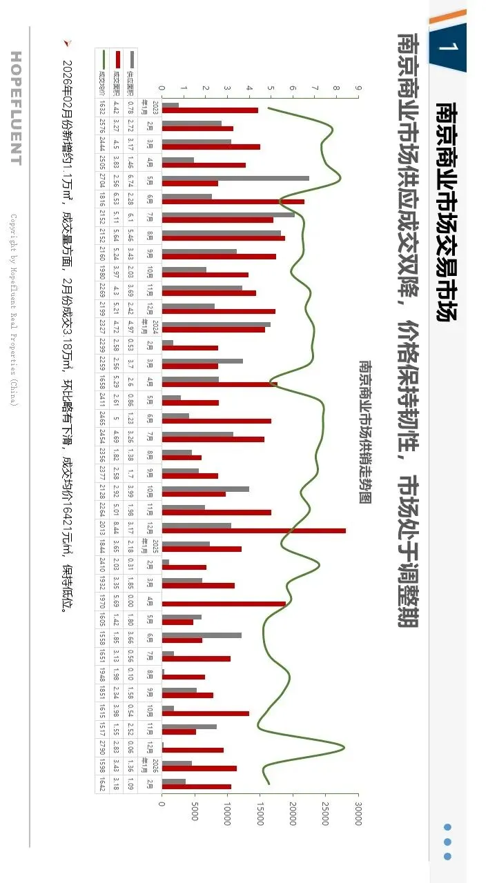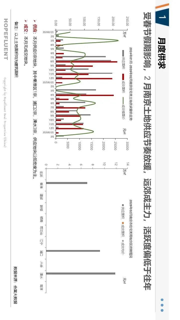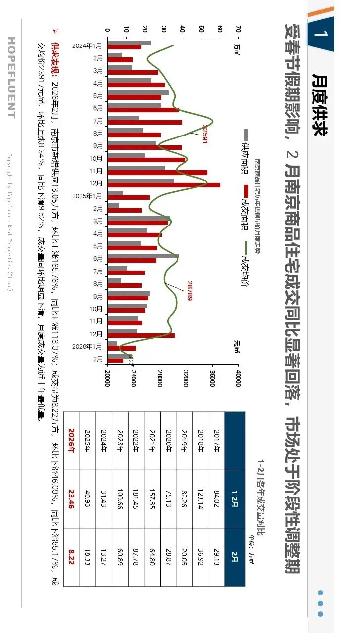 2026年2月,南京新房市场受春节假期影响,整体呈现量缩价稳、结构性调整态势,政策托底效果持续显现。受假期置业节奏放缓影响,新房成交量环比有所回落,市场整体处于淡季休整阶段;价格保持平稳,部分优质板块及改善项目价格环比小幅上涨,市场信心有待修复。供应端小幅收缩,江宁、浦口等区域仍是主力供应板块,产品以刚需及改善户型为主。人才购房补贴、房票政策、公积金支持等利好持续落地,有效激活人才及合理住房需求,成为市场重要支撑。
