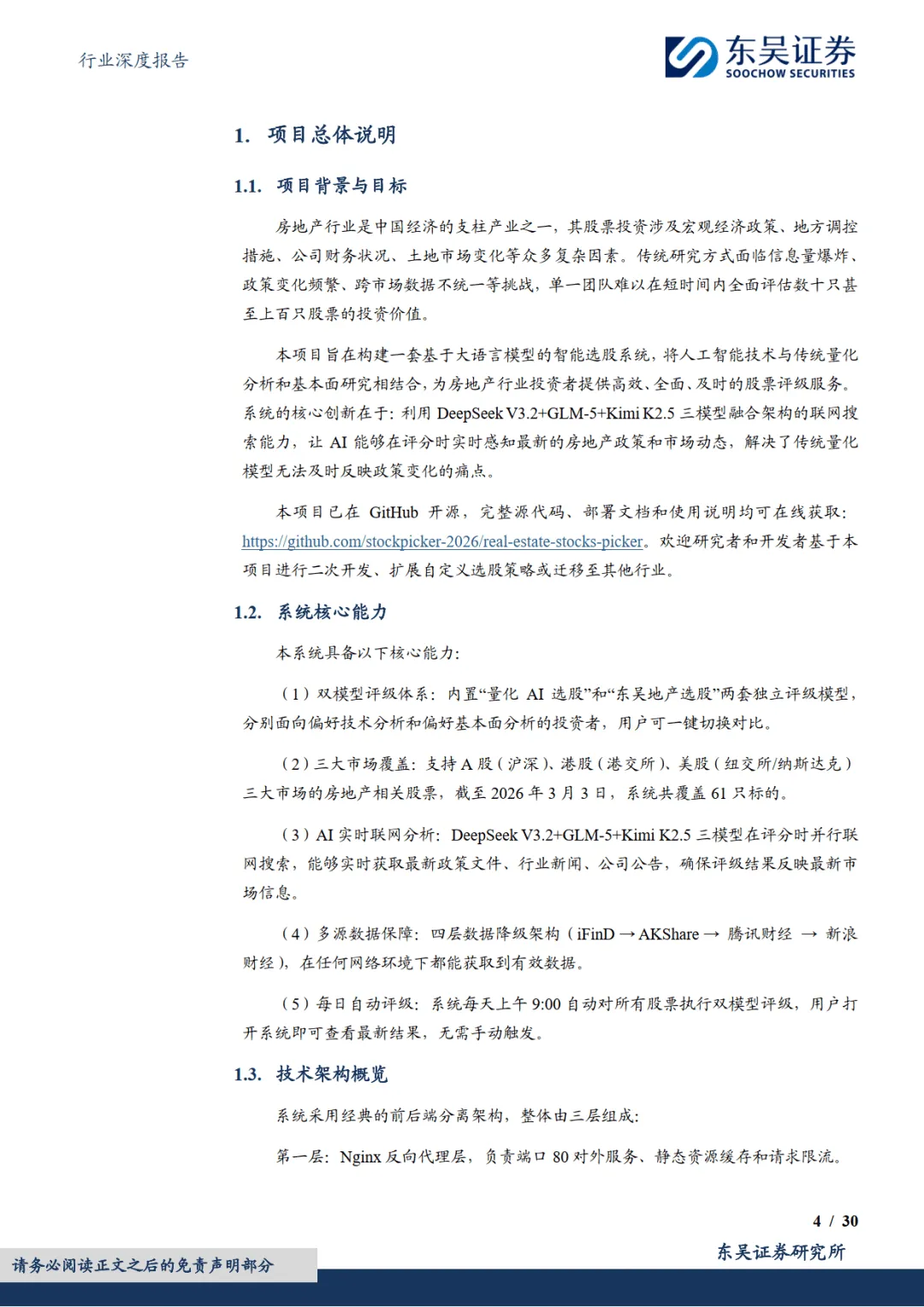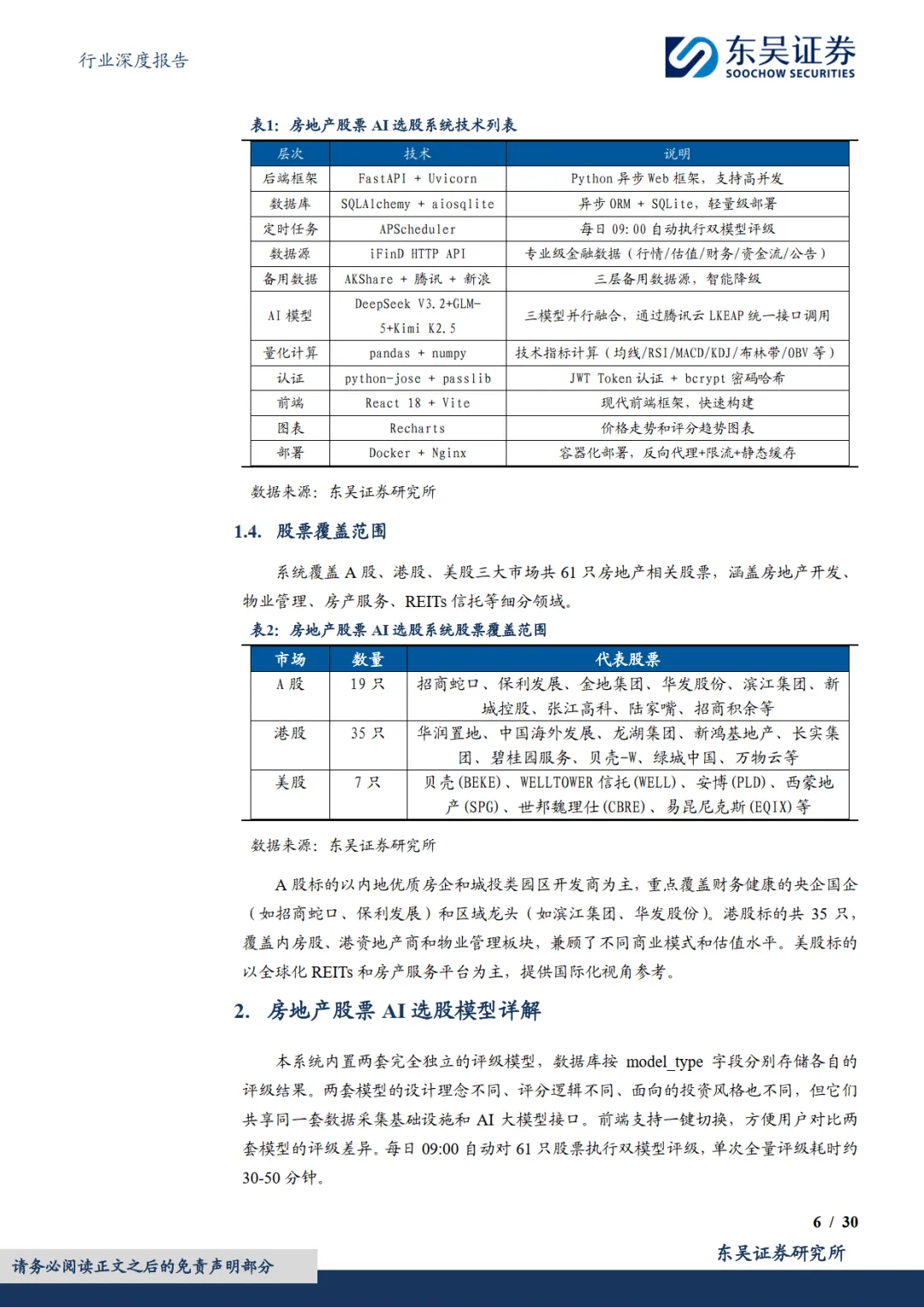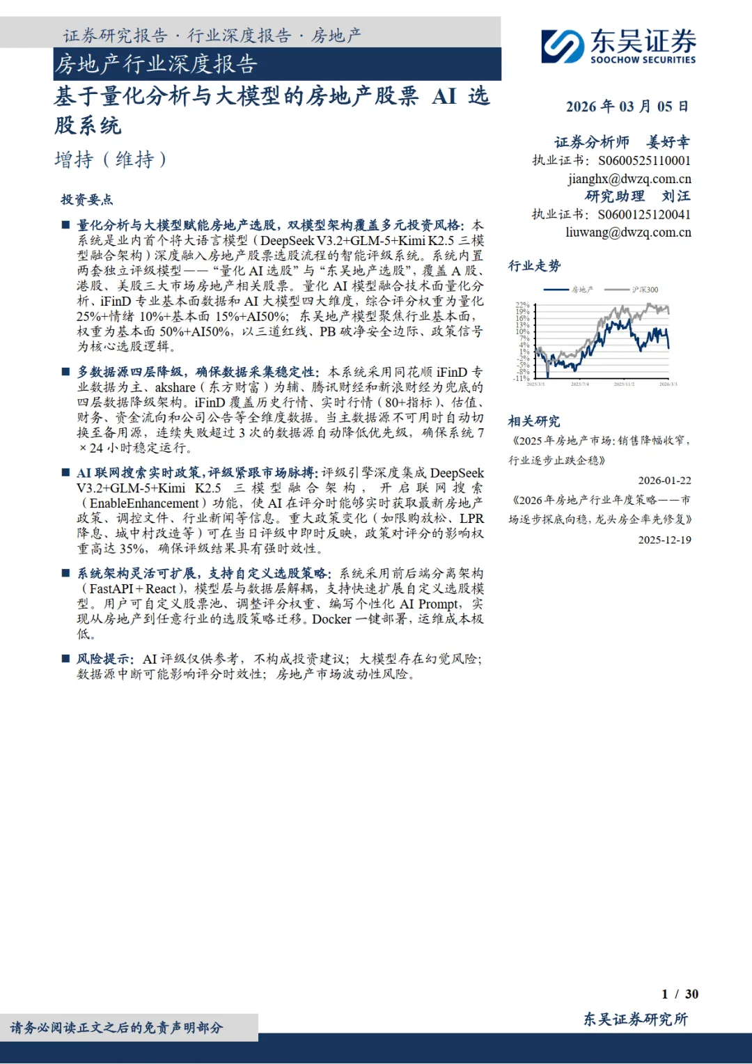 2026 年 3 月东吴证券发布房地产行业深度报告,推出业内首个融合大语言模型的房地产股票 AI 选股系统,维持行业增持评级。该系统打造双模型架构,覆盖 A、港、美三大市场 61 只地产相关股票,通过量化分析、大模型技术与多源数据融合,解决传统地产选股信息繁杂、政策响应滞后等痛点,同时支持自定义策略与跨行业迁移,为不同风格投资者提供高效评级服务。————