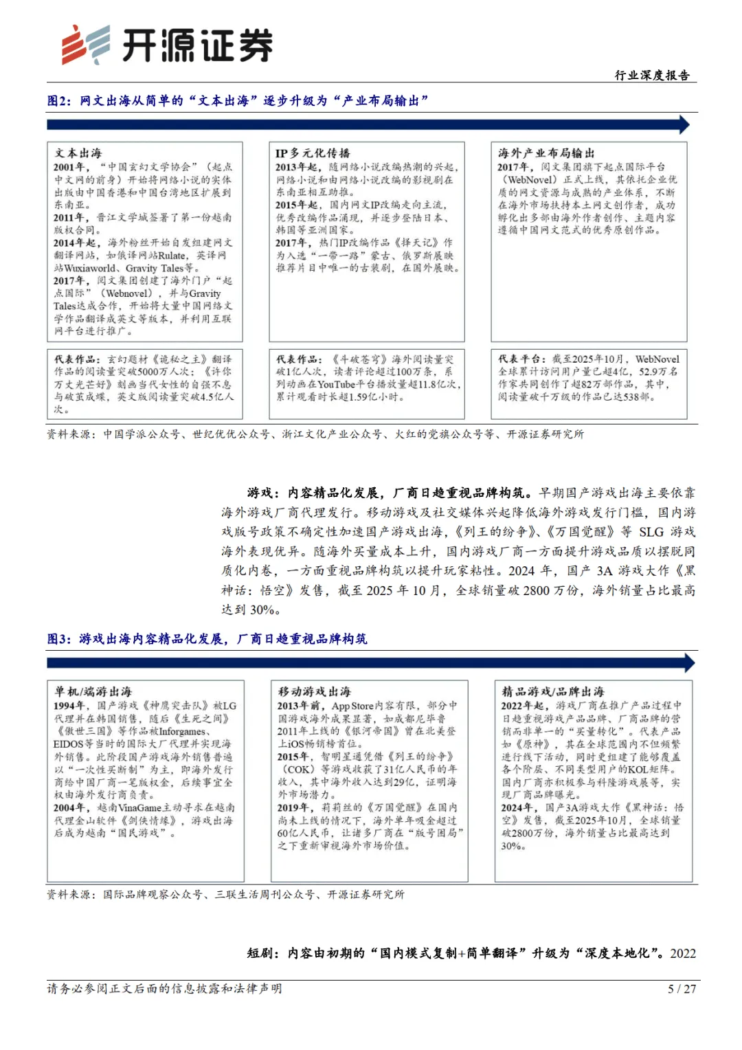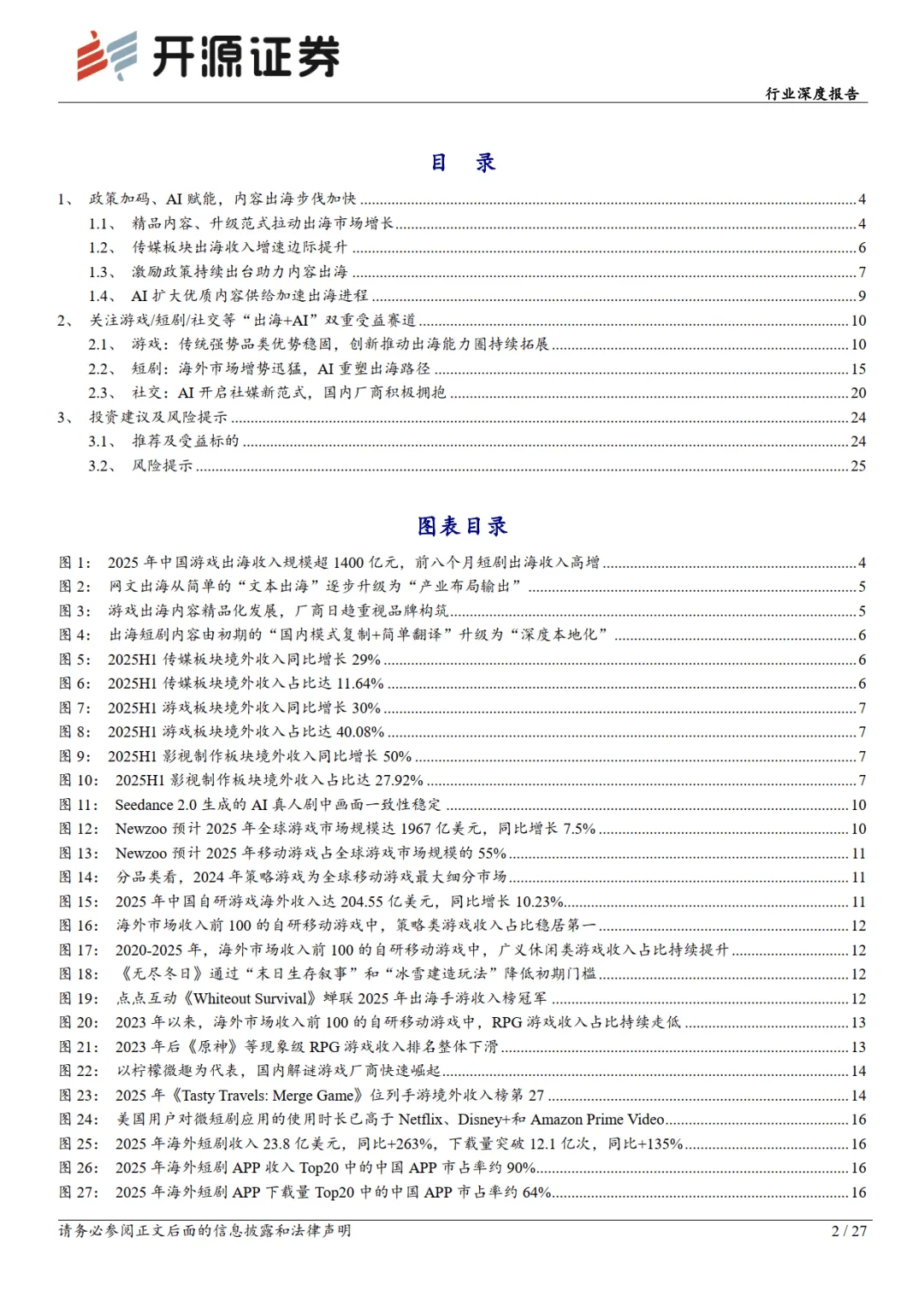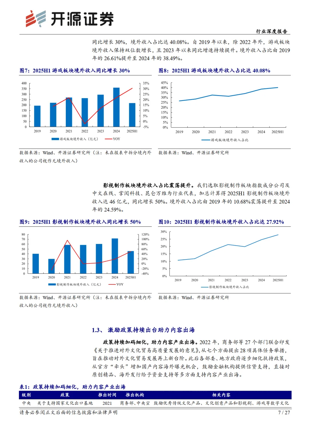 数据显示,2019-2024 年传媒板块境外收入占比从 5.7% 升至 10.4%,游戏、影视制作板块分别升至 38.5%、24.6%,2025H1 传媒、游戏、影视制作板块境外收入同比分别增 29%、30%、50%,出海增速持续边际提升。中华文化为内容出海提供丰富素材,叠加中央及地方持续出台文化出口扶持政策,从资金、渠道、曝光多维度助力,为行业发展奠定基础。————