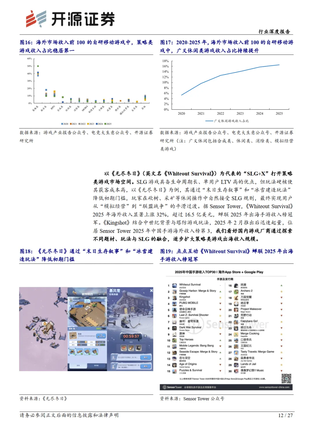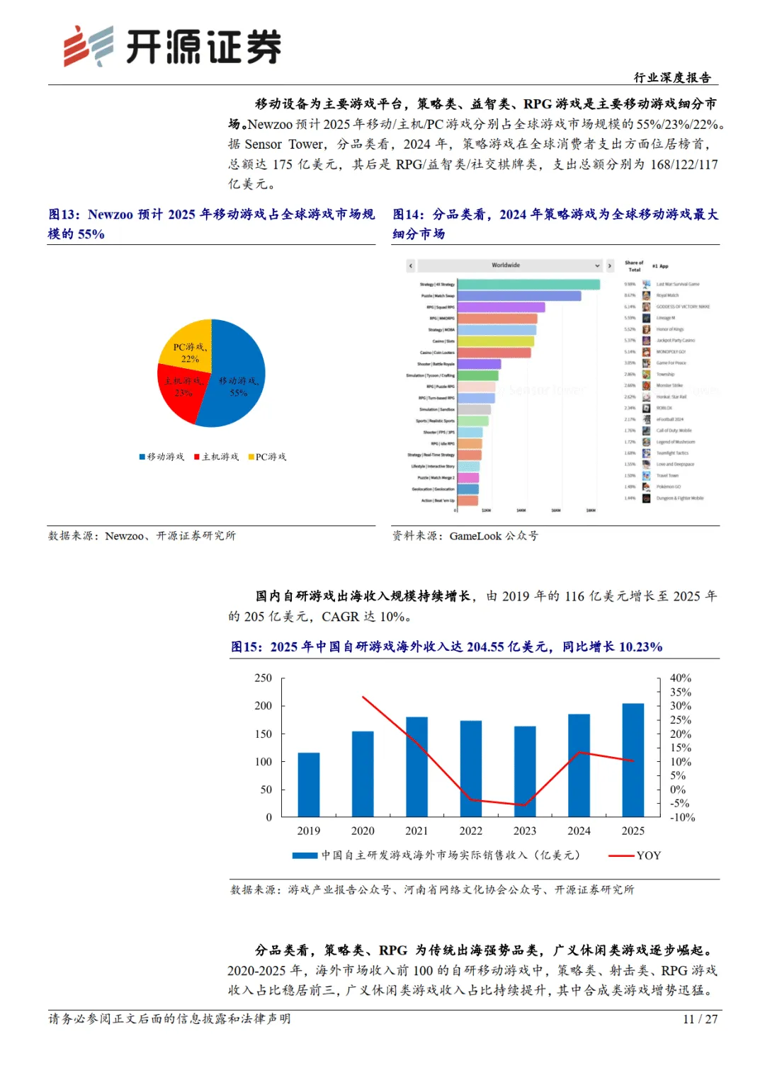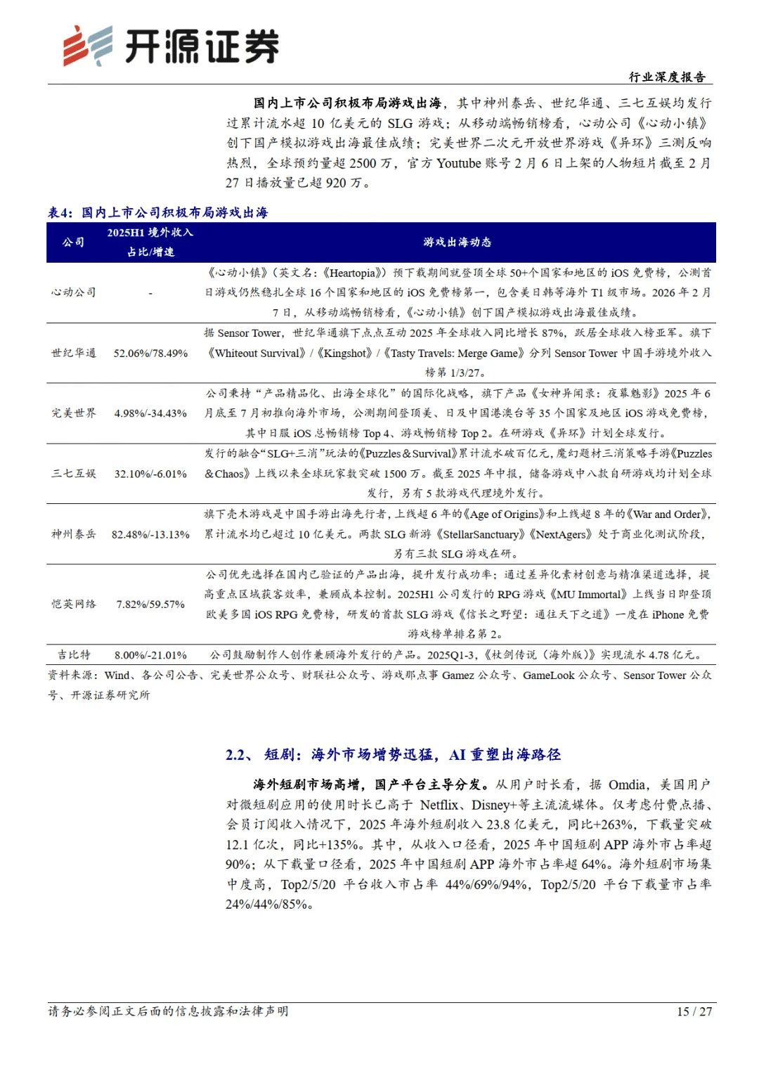 数据显示,2019-2024 年传媒板块境外收入占比从 5.7% 升至 10.4%,游戏、影视制作板块分别升至 38.5%、24.6%,2025H1 传媒、游戏、影视制作板块境外收入同比分别增 29%、30%、50%,出海增速持续边际提升。中华文化为内容出海提供丰富素材,叠加中央及地方持续出台文化出口扶持政策,从资金、渠道、曝光多维度助力,为行业发展奠定基础。————