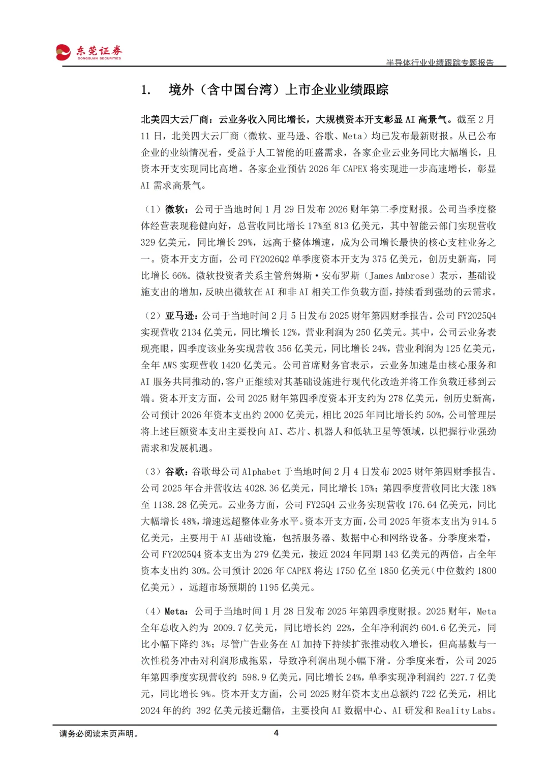 境外(含中国台湾)上市企业业绩情况。1)北美四大云厂商:云收入同比增长,大规模资本开支彰显AI高景气。受益于AI旺盛需求,微软、亚马逊、谷歌、Meta四大企业25Q4云业务收入实现同比大幅增长,且资本开支同比高增。各家企业预估2026年CAPEX将实现进一步高速增长,彰显AI需求高景气;