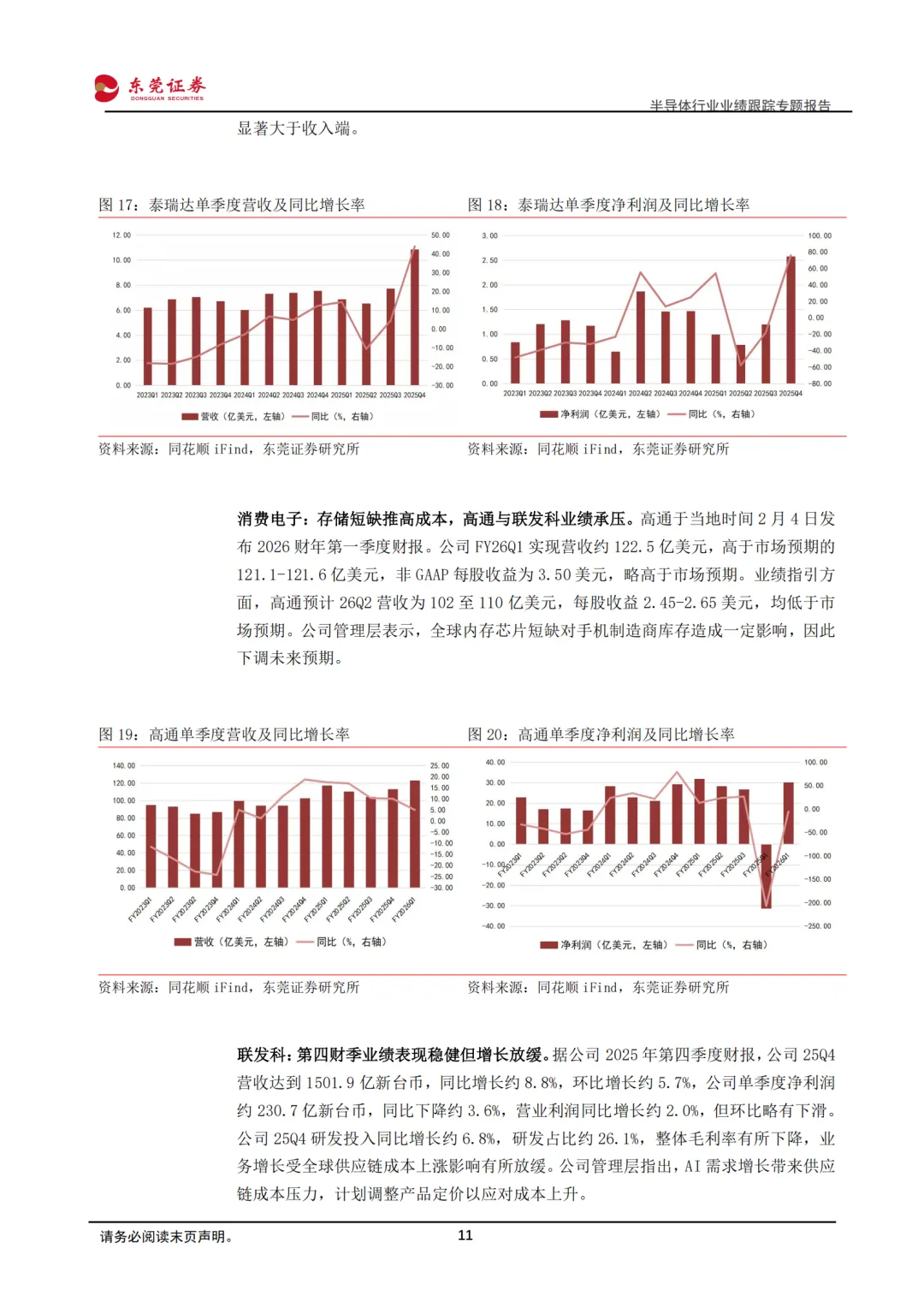 6)消费电子:存储短缺推高成本,高通与联发科业绩承压。受存储短缺、价格上涨等因素影响,以智能手机为代表的消费类电子需求承压,高通、联发科等全球SoC大厂业绩表现受挫。高通2026财年第二季度营收、每股收益指引均低于市场预期,联发科2025年第四财季业绩表现稳健但增长放缓,AI需求增长带来供应链成本压力,计划调整产品定价以应对成本上升。