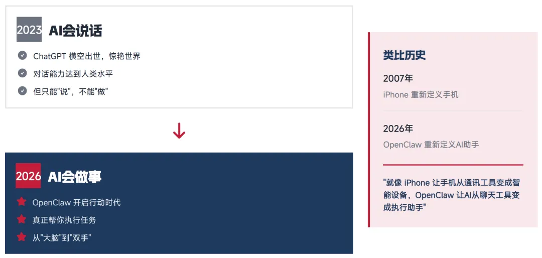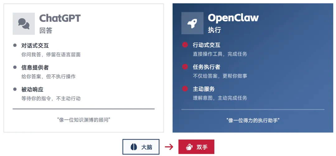 2023 年,ChatGPT 的横空出世标志着 AI 对话能力达到人类水平,开启了 AI"会说话" 的时代。然而,这一阶段的 AI 本质上仍是 "信息提供者",只能停留在语言层面,为用户提供对话式建议,无法真正介入用户的工作流程、完成实际操作与任务执行。2026 年,OpenClaw 的出现标志着 AI 发展进入全新阶段 —— 从 "大脑" 进化到 "双手",从理解语言到执行任务,是 AI 从 "会说话" 到 "会做事" 的关键转折点,也是 AI 从对话工具向执行助手的重大跃迁。