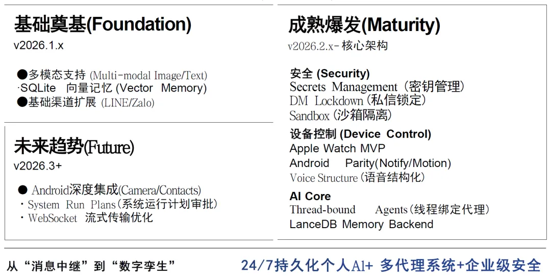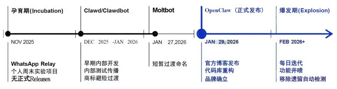 项目发展历程可清晰划分为三个核心阶段:第一阶段为 2025 年 11 月至 12 月的孕育期,项目处于早期内部开发与测试传播阶段,仅为个人实验项目,无正式版本发布;第二阶段为 2025 年 12 月至 2026 年 1 月的商标避险与架构重构期,项目完成代码库重构、移除遗留自动检测功能,实现了从 “消息中继” 到 “数字孪生” 的能力跃迁,同时完成品牌的确立;第三阶段为 2026 年 2 月至今的爆发期,项目进入每日迭代、功能井喷的快速发展阶段,WhatsApp Relay 等核心功能陆续上线,社区生态快速扩张。