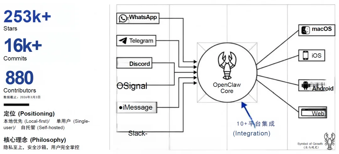 截至 2026 年 3 月 3 日,OpenClaw 在 GitHub 平台已获得 253k+Stars,累计 16k+Commits,全球贡献者数量达到 880 位,其星标数量在爆发后两个月内便超越了 Linux、React 等持续更新十余年的超大型基建项目,成为 2026 年全球最具活力的开源 AI 代理生态。