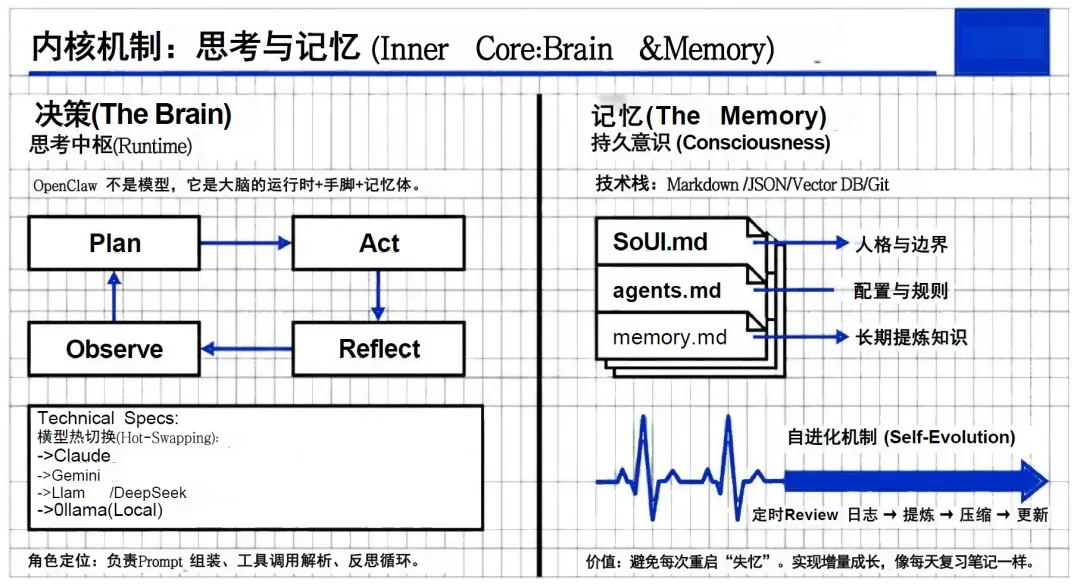 OpenClaw 的内核核心实现了决策与记忆两大核心能力的深度耦合,构建了类人的思考与记忆模式,形成了系统稳定运行的核心基础。