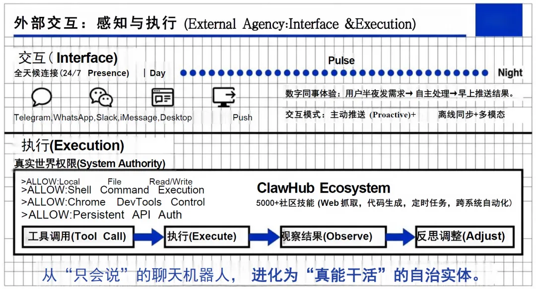 四是执行模块,作为系统的 “手脚” 与真实世界权限入口,开放了本地文件读写、Shell 命令执行、Chrome 开发者工具控制、持久化 API 授权等核心系统权限,可对接 ClawHub 生态超 5000 个社区技能,实现从工具调用、指令执行、结果观察到反思调整的完整闭环,让 AI 从 “只会说” 的聊天机器人进化为 “真能干活” 的自治实体。
