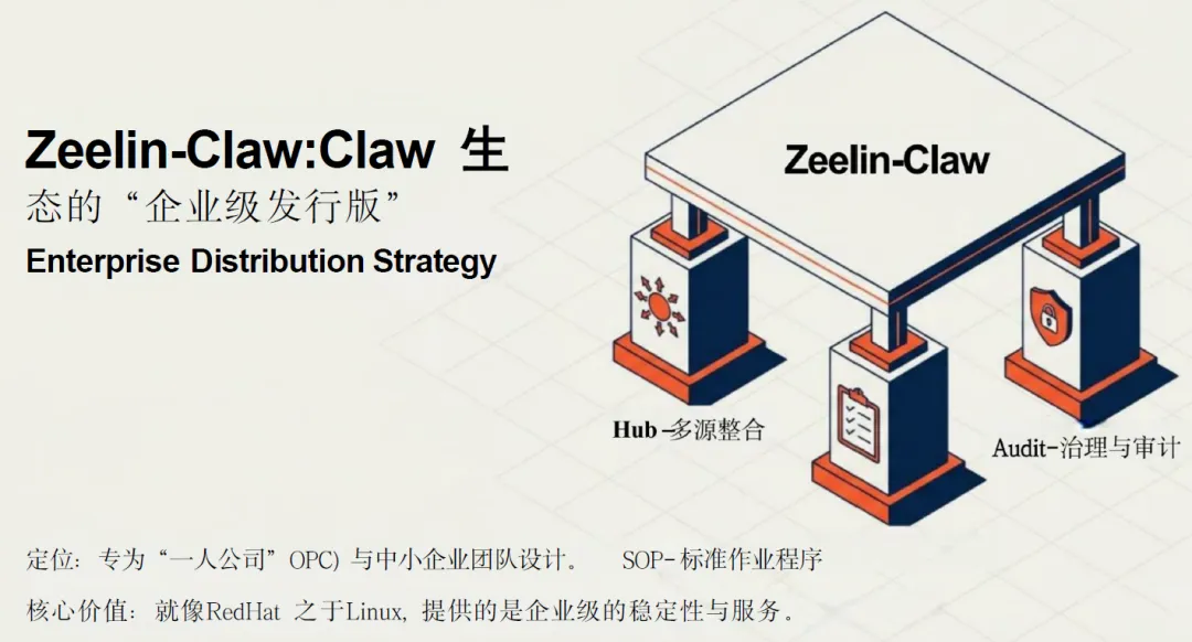 第四类是 Zeelin-Claw,其定位是 Claw 生态的 “企业级发行版”,专为一人公司与中小企业团队设计,其对于 OpenClaw 的意义如同 RedHat 之于 Linux,核心提供企业级的稳定性与服务。产品核心特性包括三点:一是将 OpenClaw 原生的 “权限全开” 模式转变为 “最小权限 + 审批流” 模式,通过沙箱模式、人机回环强制审批、三权分立的权限体系,解决企业级的安全合规问题;二是交付标准作业程序(SOP)而非简单的功能演示,内置自动重试、回滚等容错机制,确保生产环境的高可用性,覆盖财务、销售、运营等高频企业场景;三是实现了模型层与应用层的解耦,支持用 Kimi 做搜索、用通义千问做编程、用 MiniMax 做创作,在统一策略下运行,同时兼容 ClawHub 全生态技能,并针对国内飞书、钉钉、企业微信等 SaaS 的 API 进行了深度优化。除此之外,中关村科金也发布了基于 OpenClaw 的企业级解决方案 PowerClaw,将 OpenClaw 技术与企业级场景需求、安全合规要求深度融合,为企业交付可管控、懂业务的 AI 生产力引擎。