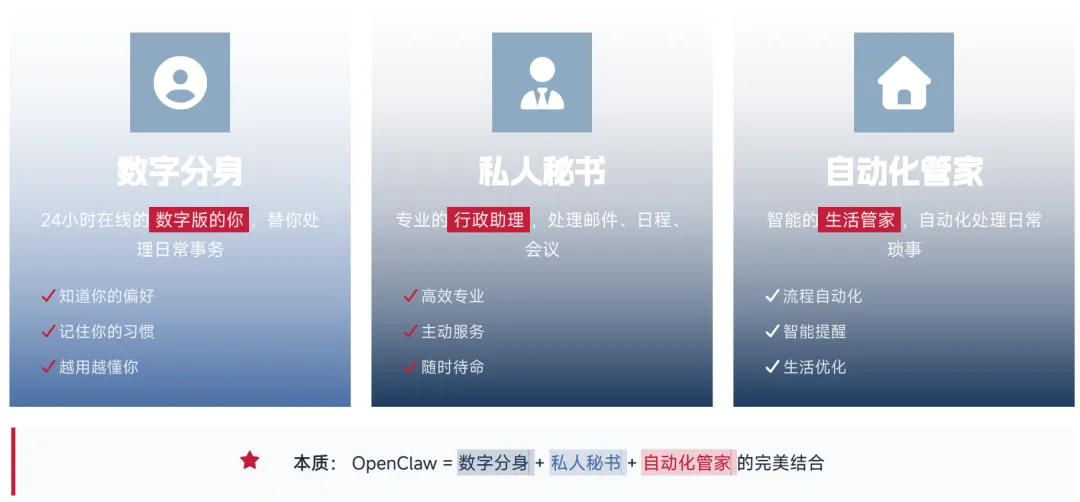 OpenClaw 的核心定位是本地优先、单用户、自托管的 AI 代理运行框架,其并非传统的对话式聊天机器人,也非单一的大语言模型,而是面向个人与企业的自托管式 AI 数字员工,核心是将大语言模型的 “思考能力” 转化为对电脑、软件与线上服务的实际操作能力,实现从 “对话式建议” 到 “自动化执行” 的本质跨越。与传统 AI 产品相比,其核心差异体现在三个维度:执行层面,ChatGPT 只能回答问题,OpenClaw 能直接操作工具完成任务;交互模式上,ChatGPT 是对话式交互,OpenClaw 是行动式交互;服务理念上,ChatGPT 是被动响应,OpenClaw 是主动服务。其本质是数字分身、私人秘书与自动化管家的完美结合,既是 24 小时在线的数字分身,能够记住用户偏好与习惯,也是专业的行政助理,同时还是实现全流程自动化的智能管家。