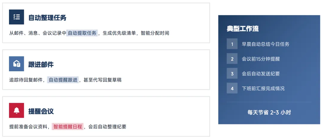 在智能管理能力层面,系统实现了全场景的任务管控与流程自动化,核心包括邮箱管理、日程协调、工作流自动化三大核心板块,可实现邮件的自动分类、回复与跟进,会议的智能安排、冲突检测与任务追踪,以及重复任务的一键执行、多工具联动与跨平台协作,形成了完整的智能管理闭环。