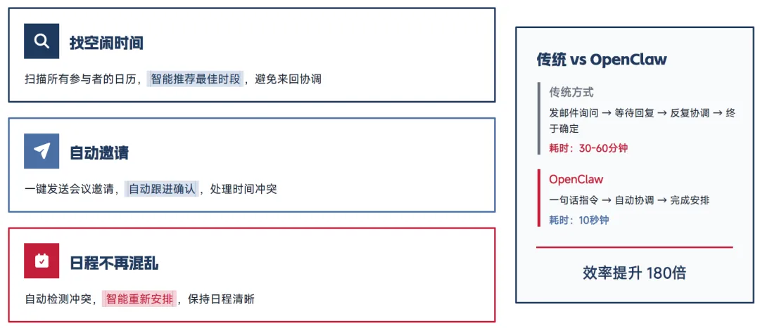 传统会议安排需反复协调参与者时间,耗时 30-60 分钟,而 OpenClaw 只需用户一句话指令,即可 10 秒完成全流程操作。其核心能力包括:扫描所有参与者日历,智能推荐最佳会议时段;一键发送会议邀请,自动跟进确认,处理时间冲突;自动检测日程冲突,智能重新安排,保持日程清晰。相较于传统模式,该场景下效率提升可达 180 倍,彻底解决了会议协调的核心痛点。