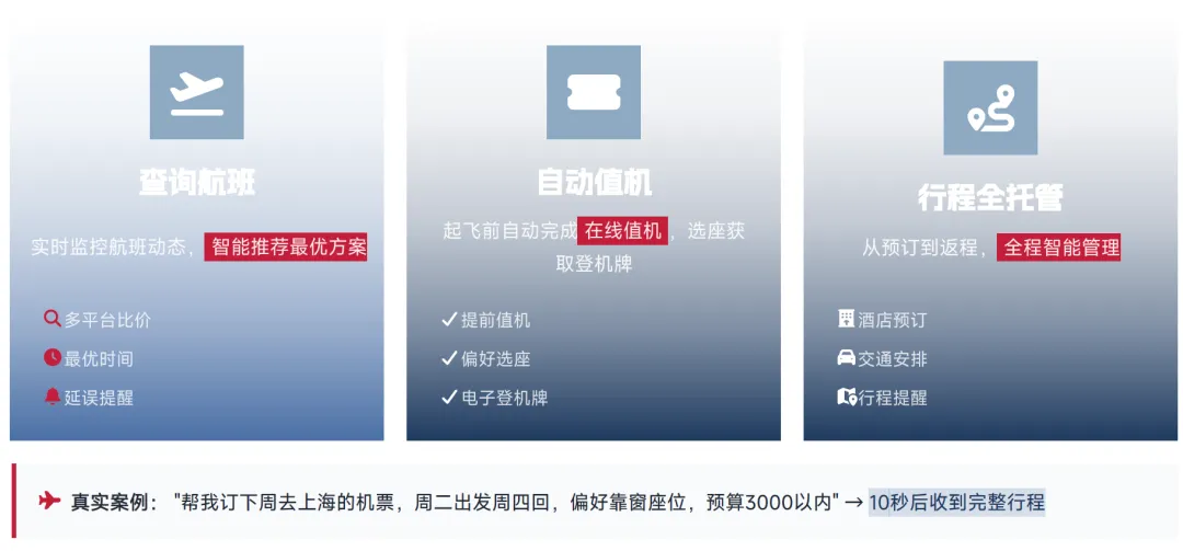 OpenClaw 作为出行助理,可为用户提供从预订到返程的全程智能管理,核心能力包括:多平台比价,实时监控航班动态,智能推荐最优出行方案;起飞前自动完成在线值机,根据用户偏好选座并获取登机牌;完成酒店预订、交通安排、行程提醒等全流程行程托管。真实落地案例显示,用户下达 "帮我订下周去上海的机票,周二出发周四回,偏好靠窗座位,预算 3000 以内" 的指令后,系统 10 秒内即可为用户生成完整行程方案。