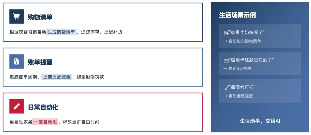 OpenClaw 可实现生活琐事的全自动化处理,释放用户的自由时间,核心能力包括:根据用户饮食习惯自动生成购物清单,追踪家庭物资库存,提醒补货;追踪账单周期,提前提醒缴费,避免逾期罚款;实现重复性家务的一键自动化,构建标准化生活流程。具体落地场景包括:用户提及 "家里牛奶快没了",系统自动加入购物清单;用户设置 "每周六打扫",系统自动创建提醒;信用卡还款日前 3 天,系统自动向用户发出提醒,实现了生活琐事的全流程智能管控。