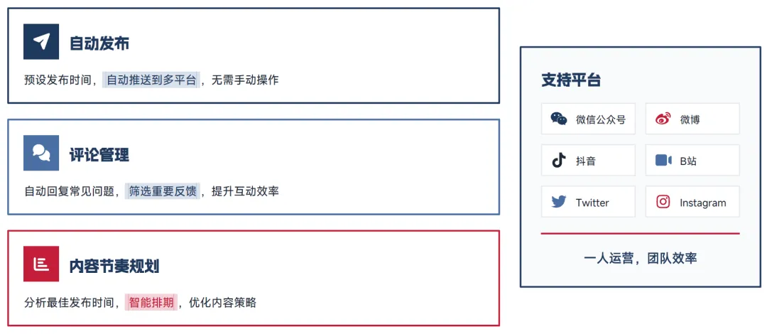 OpenClaw 可助力自媒体运营实现一人运营、团队级效率,核心能力包括:预设发布时间,自动将内容推送到微信公众号、微博、抖音、B 站、Twitter、Instagram 等多平台;自动回复评论区常见问题,筛选重要反馈向用户同步,提升互动效率;分析平台最佳发布时间,完成内容智能排期,优化内容运营策略。通过全流程的自动化管控,大幅降低了自媒体运营的人力成本与时间投入。