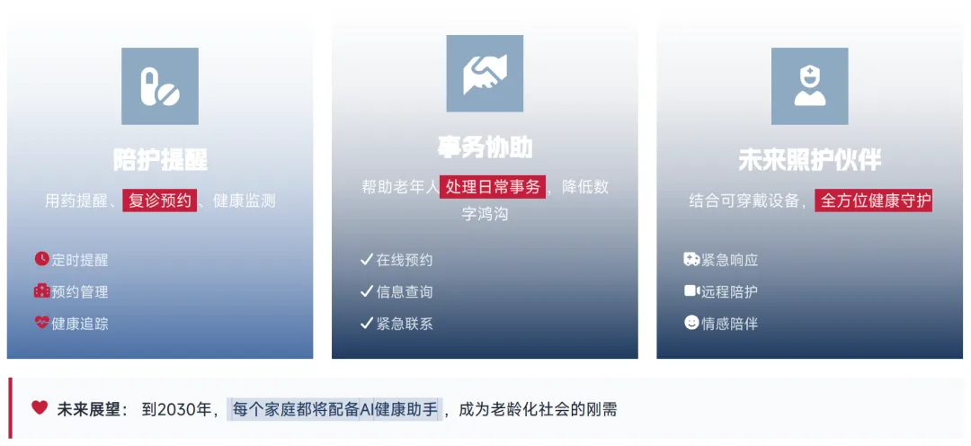 OpenClaw 在医疗与养老领域可提供智能陪护服务,核心能力包括:定时提醒用户用药,完成复诊预约,配合可穿戴设备实现健康监测;帮助老年人处理线上缴费、业务办理等日常事务,降低数字鸿沟带来的不便。行业展望显示,到 2030 年,每个家庭都将配备此类 AI 健康助手,将成为老龄化社会的刚需产品。