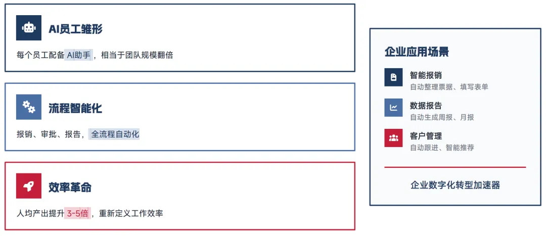 对于企业而言,OpenClaw 带来了企业级生产流程的重构,企业需要的不再是更聪明的大模型,而是一个可控的 AI 生产系统。通过 OpenClaw 及其企业级发行版,企业可将标准化、流程化的工作全部交由 AI 数字员工完成,同时通过最小权限、审批流、审计追溯、沙箱隔离等机制,实现 AI 执行过程的全流程可控,既提升了业务运行效率,又满足了企业的合规管理要求。这种重构不仅局限于单一环节,而是覆盖财务、销售、运营、市场、客服等全业务链条,实现企业经营的全流程智能化升级。
